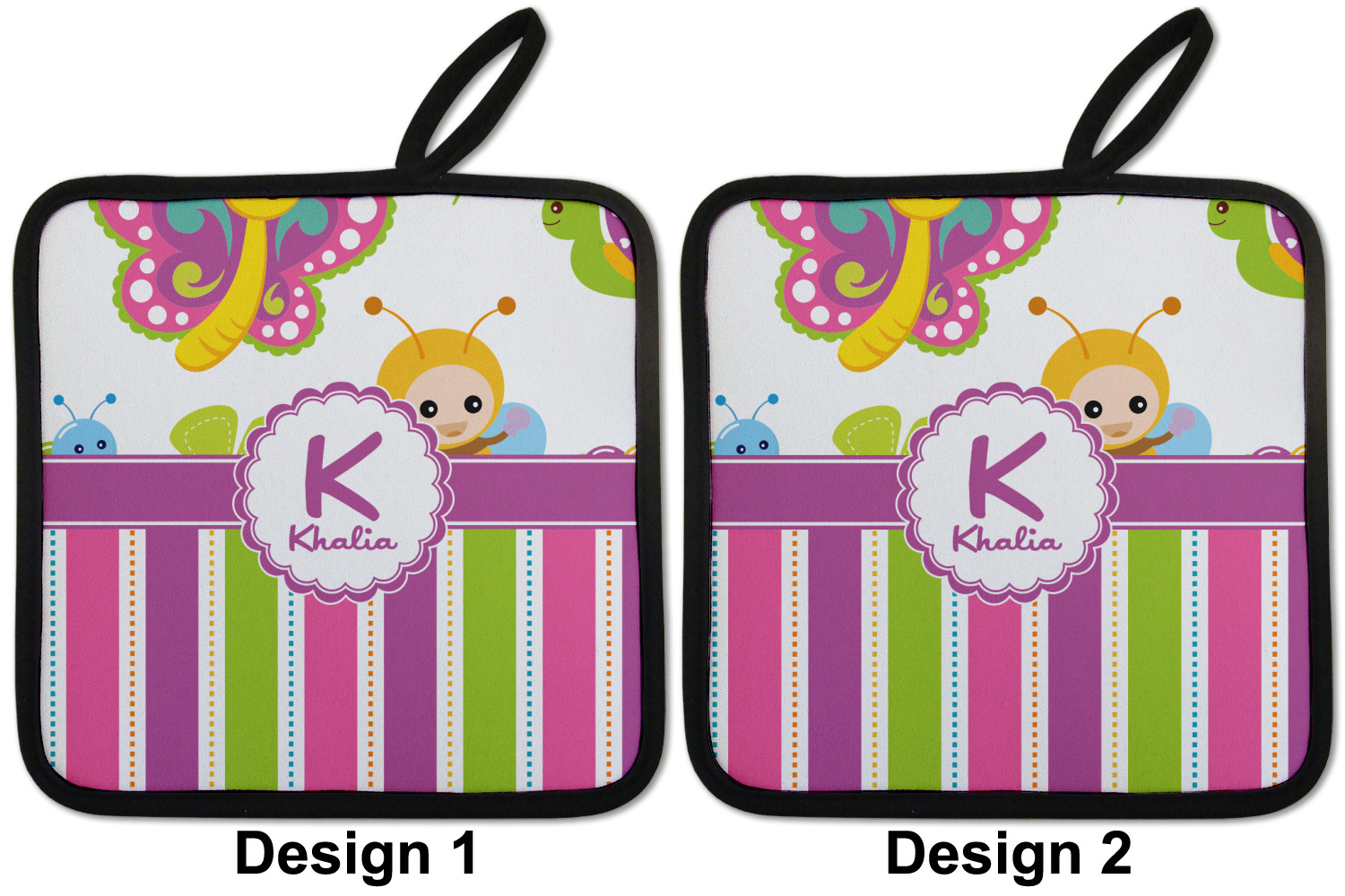 Our personalized pot holders feature a neoprene front that displays your personalization in vibrant colors. The backing of the hot pot holder is rubberized; the textured backing allows you to have a great grip when using this custom pot holder. The two materials are joined with a sleek, black trim, and the holder also includes an attached loop for hanging and storage. The pot holder is approximately 8.75 inches by 8.75 inches and 0.25 inches tall, while the fabric loop is 2.5 inches long. You can purchase a kitchen pot holder by itself or as a set of 2. We also offer a set including one pot holder and one oven mitt.