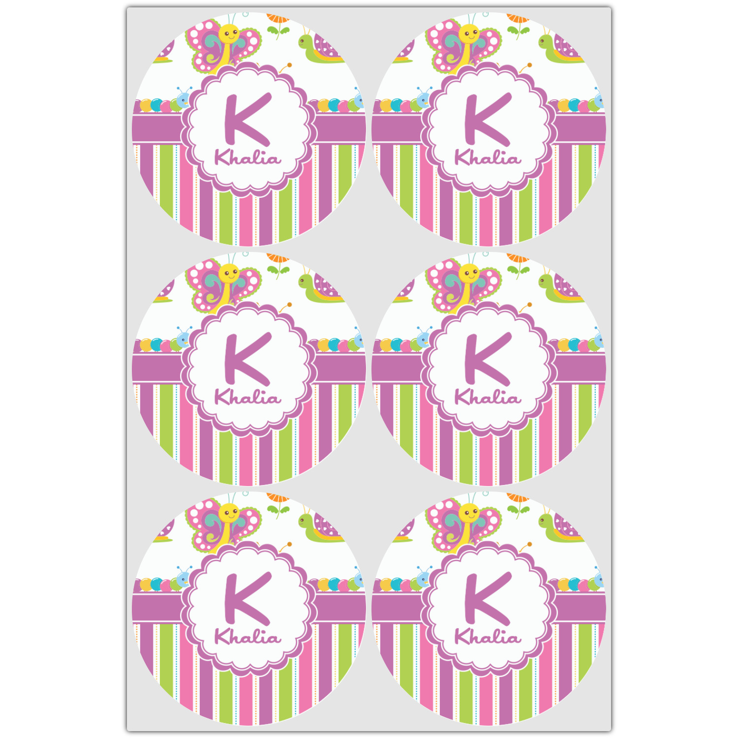 A wide band of purple with an inset of white pull the pattern together. A purple trimmed scalloped white circle allows ample room for custom personalization.