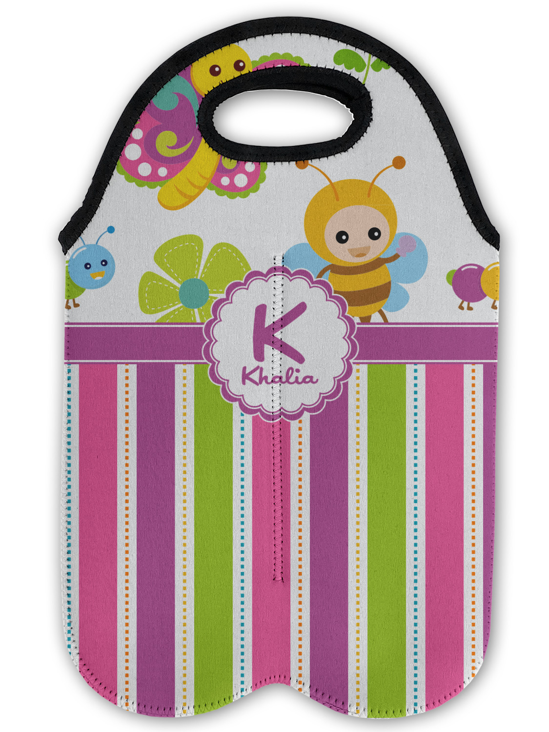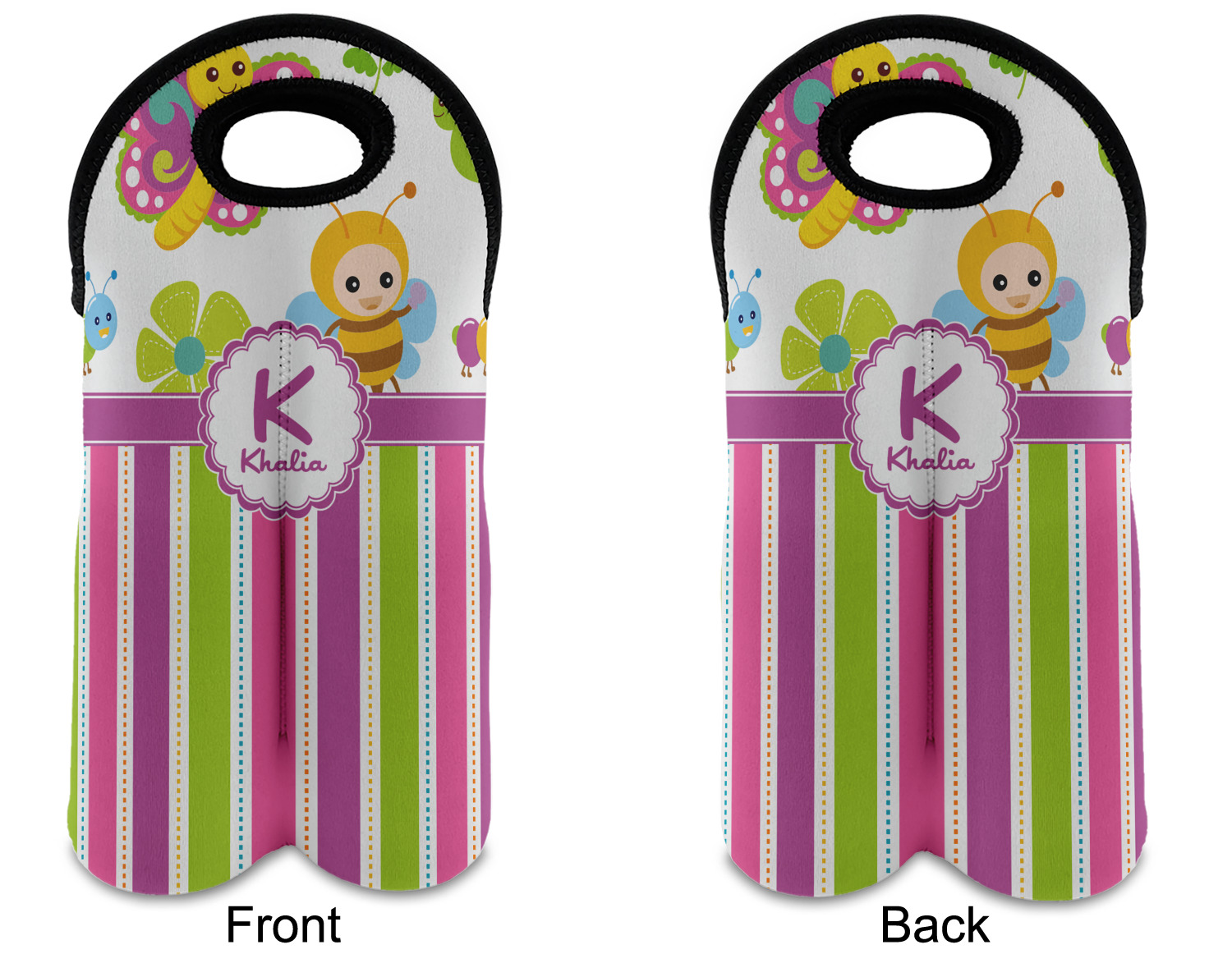 These tote bags are insulated to keep the bottles cold and have a stitched separation down the middle and double handles to keep the two bottles safe and secure during travels.