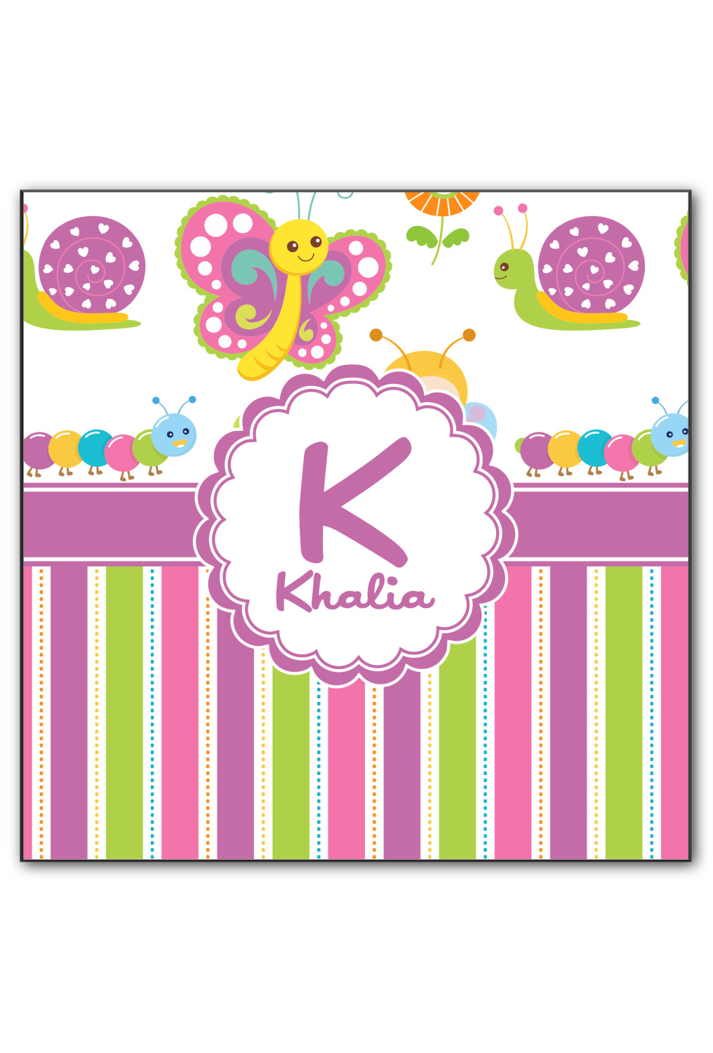 Your little girl can have her own spring garden all to herself. Butterflies, bees, snails, and flowers fill the top part of this design that will surely invoke fantasy and delight for your little one. Pink, purple, blue, green, orange and yellow stripes on the bottom of the design offer a very versatile pallet for easy decorating coordination.