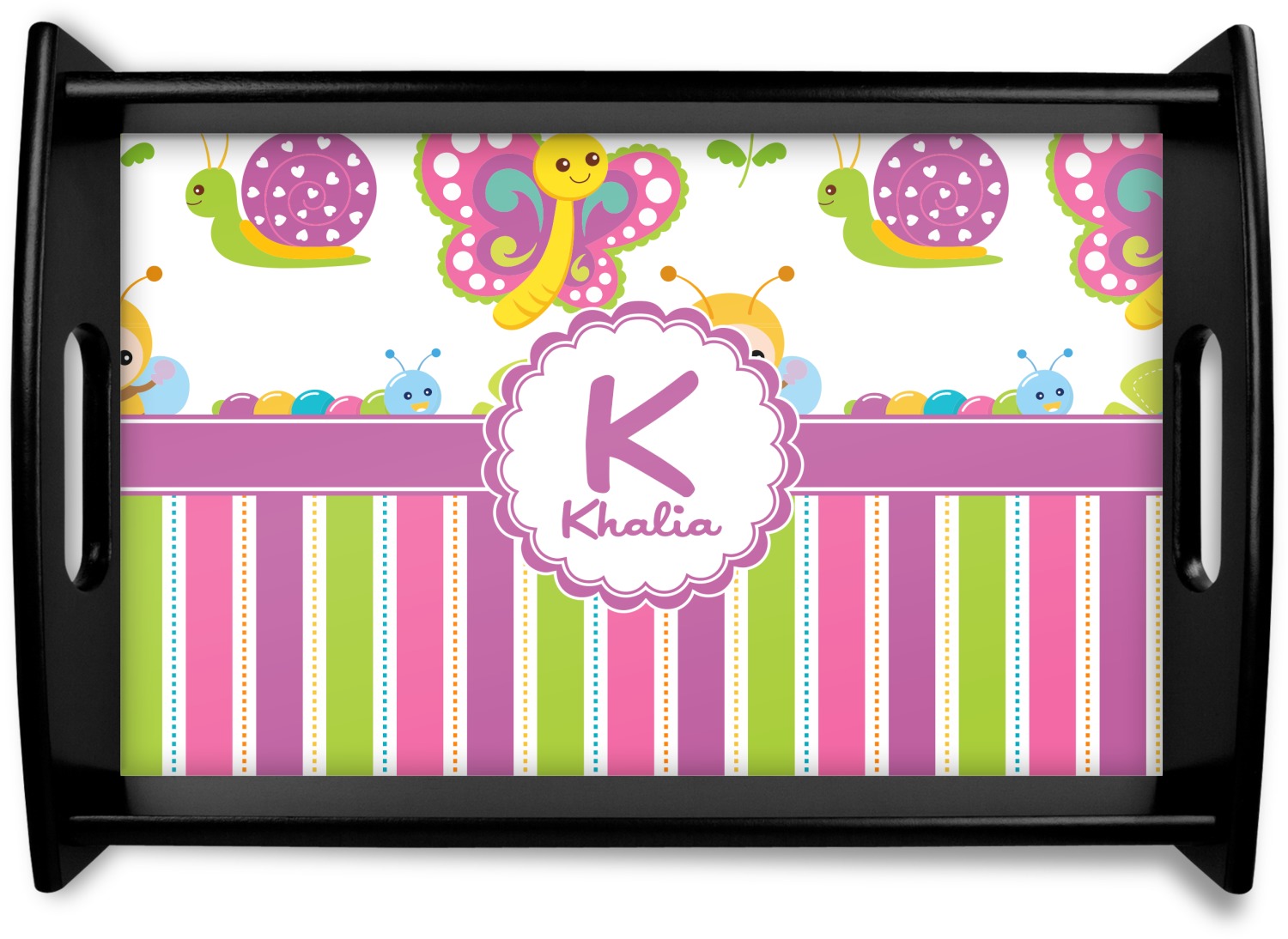This serving tray with handles features square edges and two rounded sides, creating a very modern look. Each side is fabricated from a beautifully cut, natural wood. The bottom of the interior of the tray displays your customized design in bright, vibrant color. The tray is sold in both a black color and a natural wood look. Each variation of the wood serving tray has two sizes: Small, which is 14" x 10" x 2.25", and Large, which is 19.5" x 13.5" x 2.75".