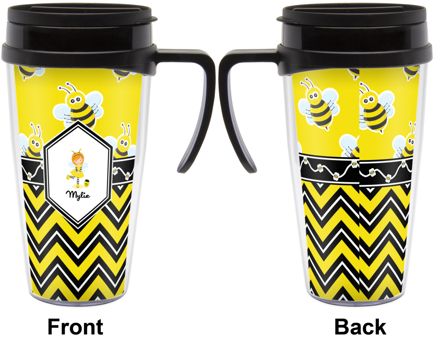 These thermal mugs are free of BPA, and insulated, to keep your drinks hot or cold. The black, snap on lid and the slider for sipping allows you to conveniently sip your drink without constantly worrying about a disastrous spill. We offer this mug with and without a handle, to better suit your needs. Each custom thermal mug holds up to 16 ounces of liquid and displays your customization on all sides on premium gloss media inserts.