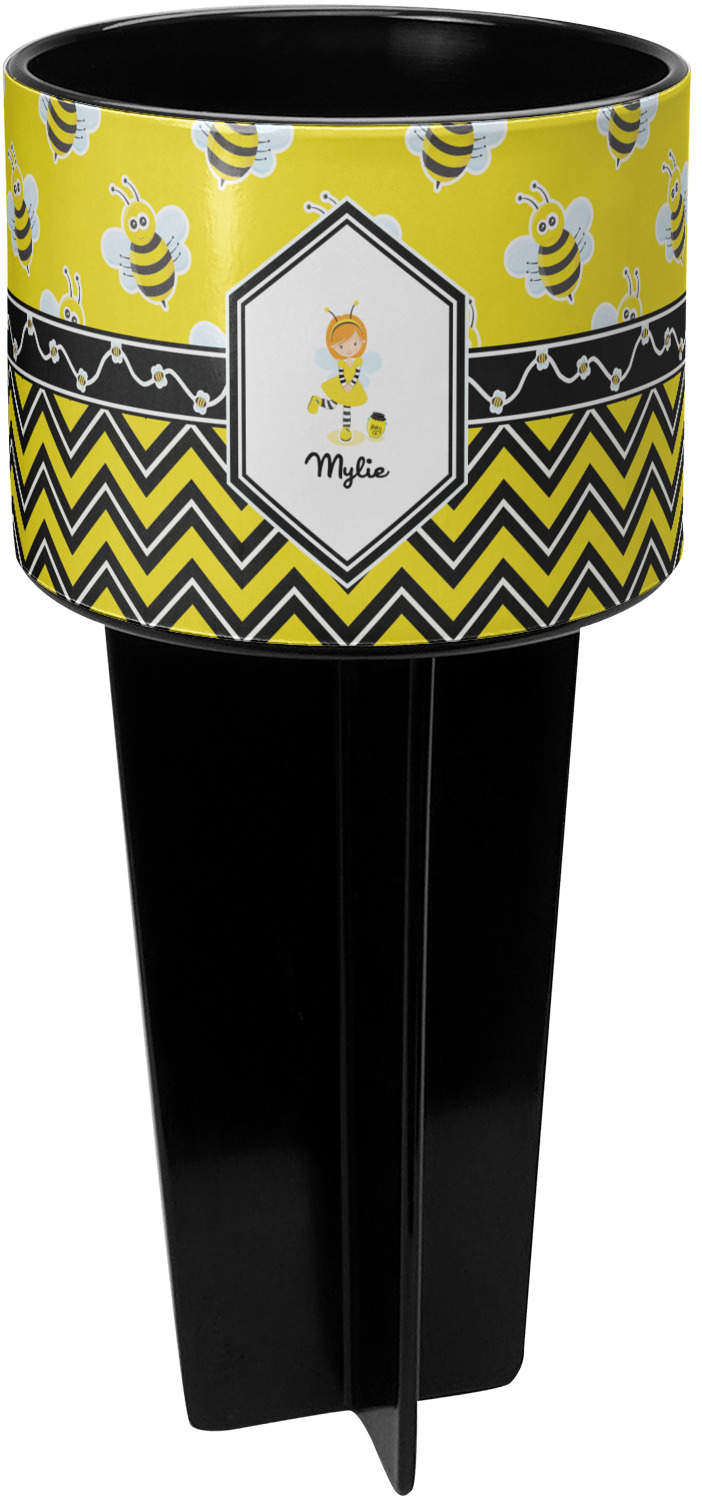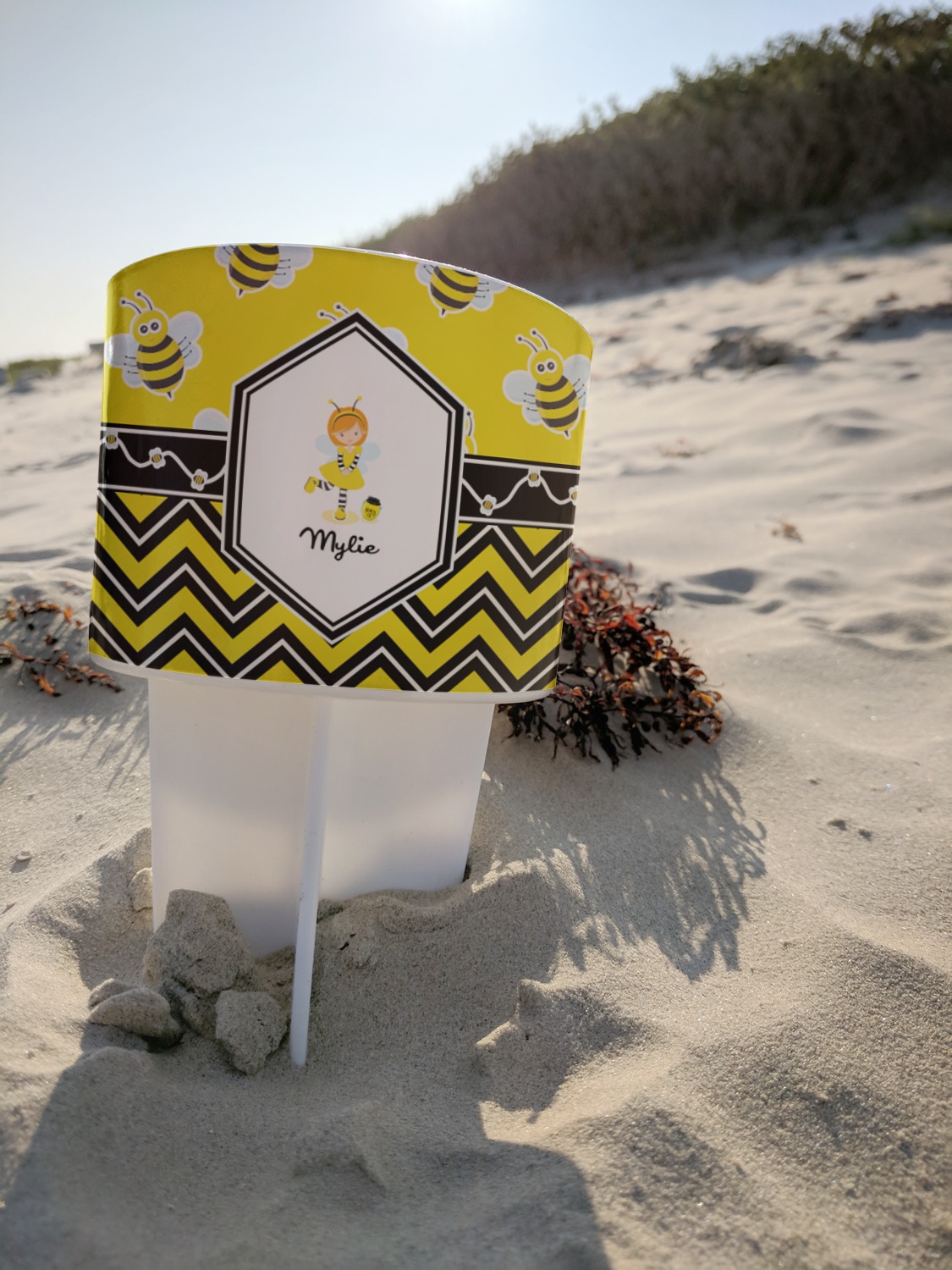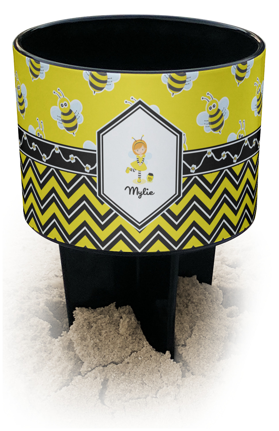 This cup holder has a large stake at its bottom that anchors it to the sand or ground below, while the cup holder rests above the stake. The entire drink holder is made of durable plastic and displays your customization around the cup holder portion. We sell these personalized beach spikers in two different colors: black and white.