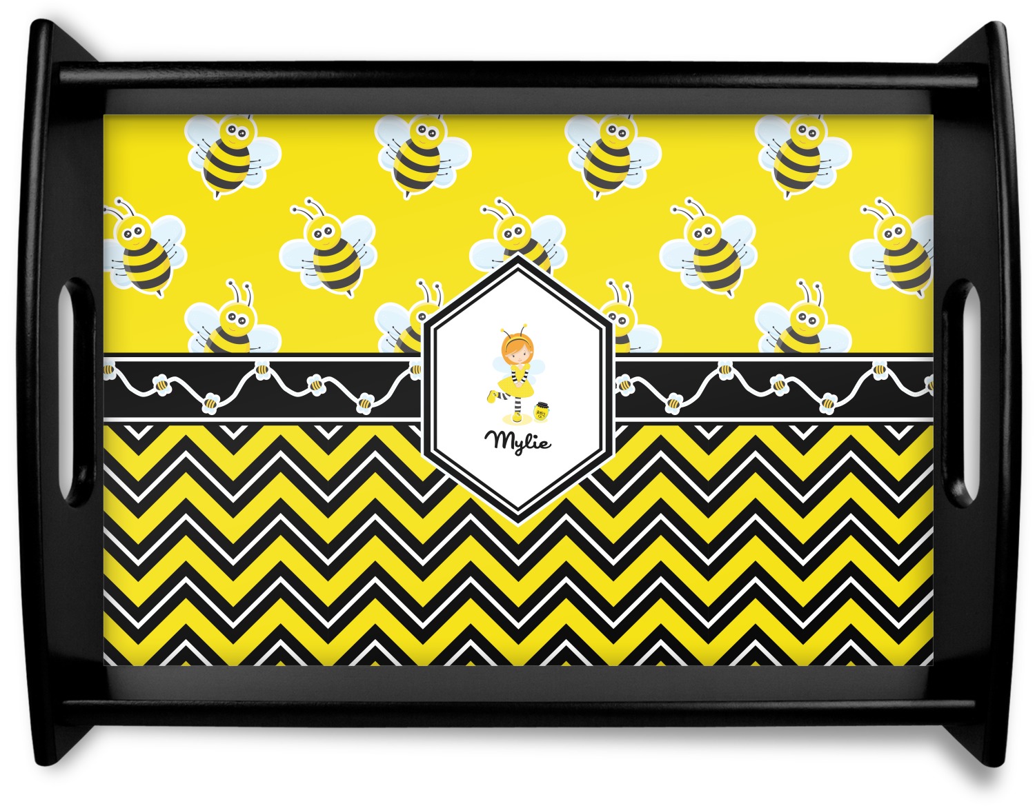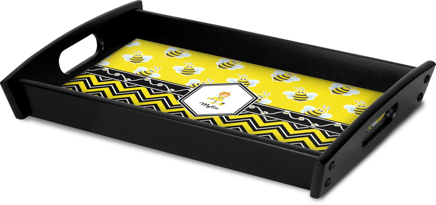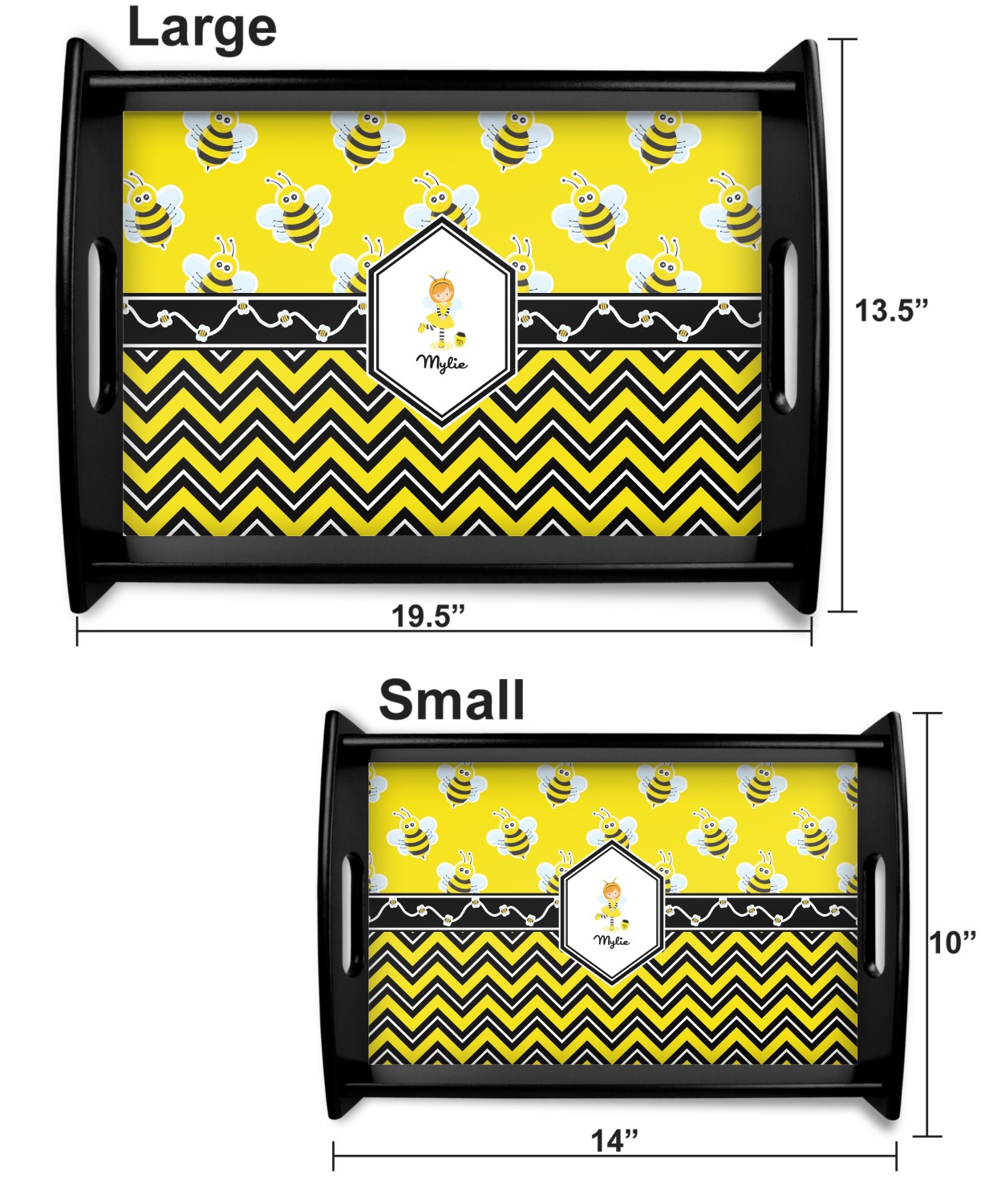 This serving tray with handles features square edges and two rounded sides, creating a very modern look. Each side is fabricated from a beautifully cut, natural wood. The bottom of the interior of the tray displays your customized design in bright, vibrant color. The tray is sold in both a black color and a natural wood look. Each variation of the wood serving tray has two sizes: Small, which is 14" x 10" x 2.25", and Large, which is 19.5" x 13.5" x 2.75".