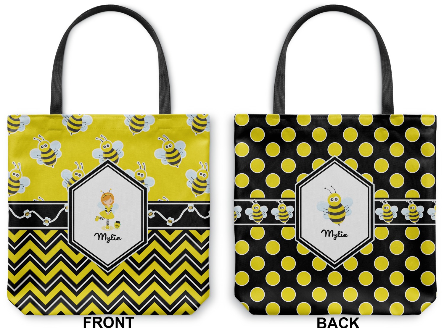 Our totes are made right here in the USA. Your design is printed on canvas fabric; the fabric is then cut and sewn on the sides and on the bottom to add an approximately 3.5 inch gusset. Black cotton handles are sewn in and reinforced. Your tote has a designs on both sides - the designs can be the same or different - the choice is yours. The inside of the tote has a black fused lining.