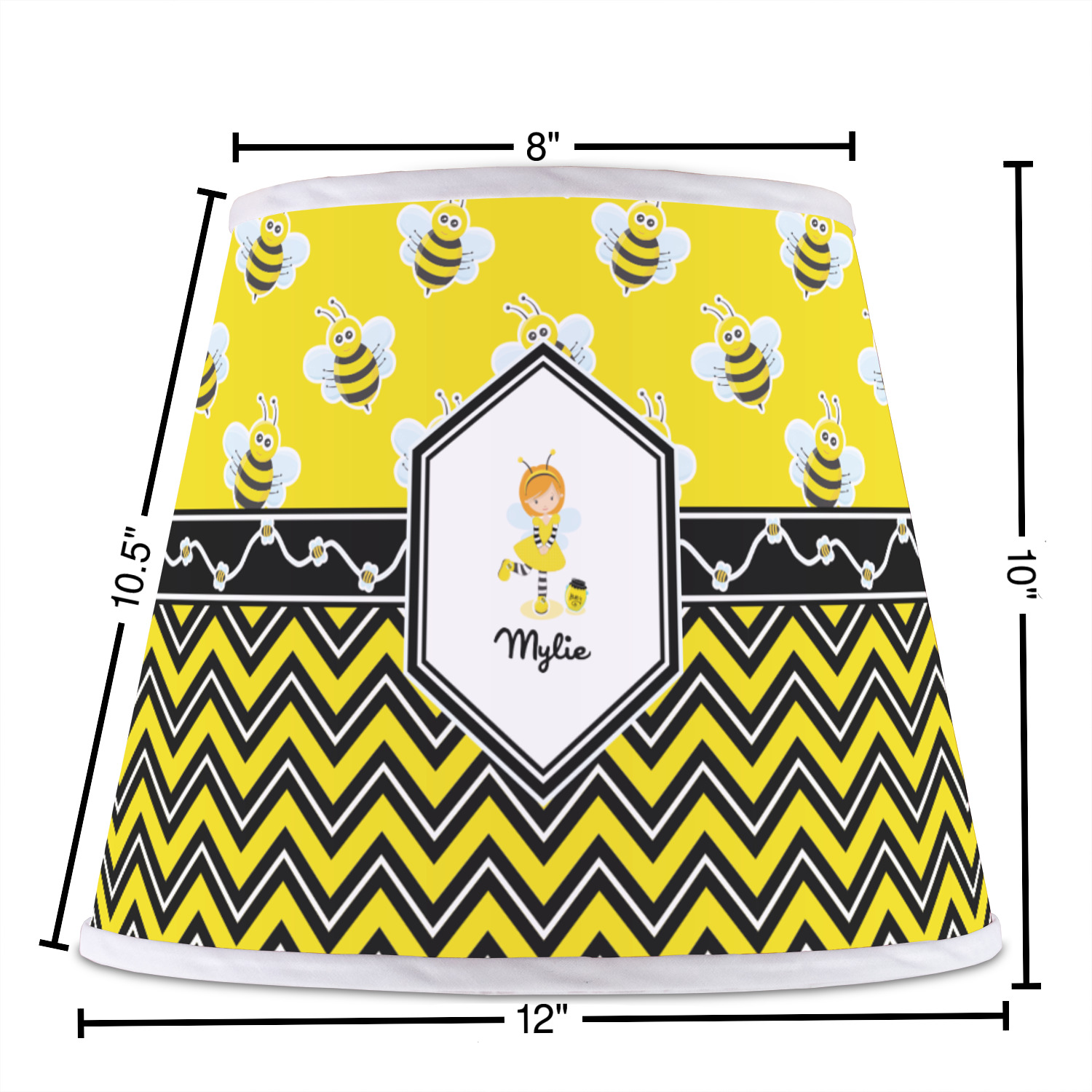 The base of this lampshade is 12 inches in diameter, and the top spans 8 inches in diameter. The total height of the lampshade is 10 inches. The angled nature of this custom lampshade concentrates the light, making it ideal for smaller spaces. This lampshade is made of matte, polyfilm, and displays your customization in its middle. The top and bottom of this colorful lamp shade are lined with a white fabric ribbon (which can be replaced with black inside the design studio) which frames your design and creates a sophisticated finish. As an UNO fitter lampshade, this unique lamp shade will fit a variety of bases.
