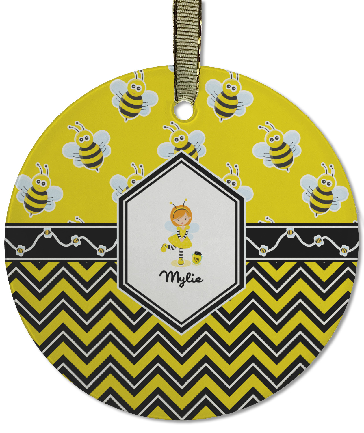 A wide white trimmed black ribbon is the background for a sweet little line of bees. A white decorative label that is trimmed in double rows of black will provide the focal point for either a little bumble-bee or a bumble-bee obsessed girl and his/her name. As a special touch, you can personalize your little bumble-bee girl's hair and skin color.