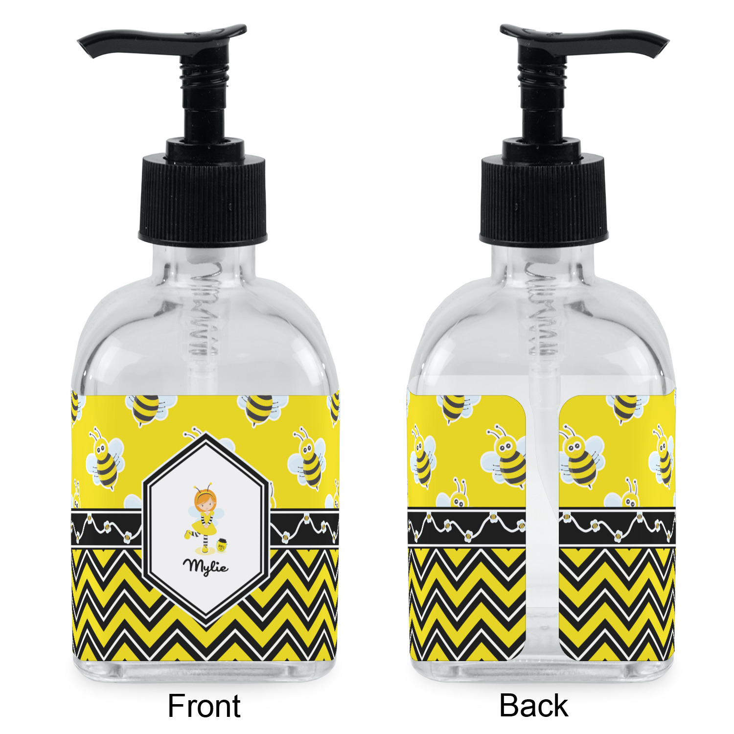 Crafted from a high-quality glass, these soap dispensers and lotion dispensers are durable and robust, while still looking elegant. They are sold with black pumps. Each soap dispenser pump measures at 6.5 by 2.25 inches. On these soap pumps, we display your customized design on a personalized vinyl adhesive on three sides. That way, you can judge how much liquid is in the bottles from the back.