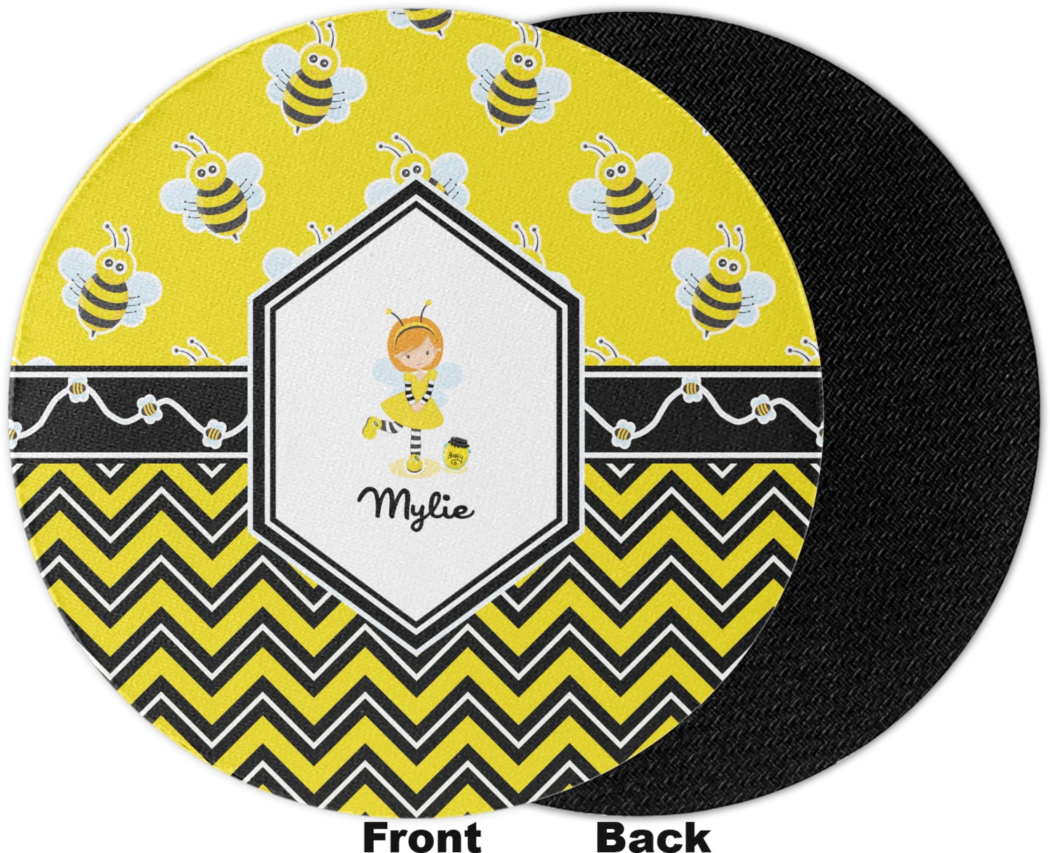 A wide white trimmed black ribbon is the background for a sweet little line of bees. A white decorative label that is trimmed in double rows of black will provide the focal point for either a little bumble-bee or a bumble-bee obsessed girl and his/her name. As a special touch, you can personalize your little bumble-bee girl's hair and skin color.