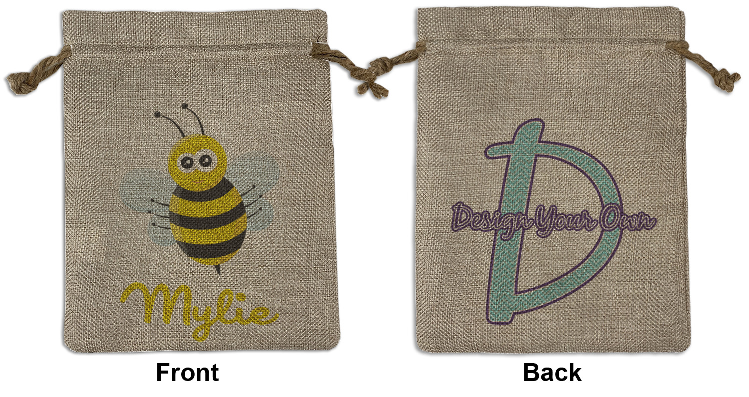 We sell our Burlap Gift Bags in 3 variant sized bags. Made with burlap polyester, each personalized bag can be secured with a twine drawstring pull. Your custom design is available to print on one side or both sides - completely up to you! The sizes of the bags measure approximately 4.5" x 6.5" for the smallest size, 6.5" x 8.0" for the medium size, and 6.5" x 13.5" for the large-sized bag.