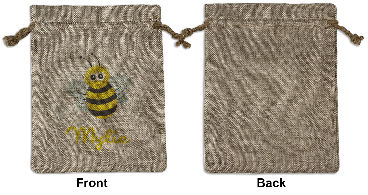 We sell our Burlap Gift Bags in 3 variant sized bags. Made with burlap polyester, each personalized bag can be secured with a twine drawstring pull. Your custom design is available to print on one side or both sides - completely up to you! The sizes of the bags measure approximately 4.5" x 6.5" for the smallest size, 6.5" x 8.0" for the medium size, and 6.5" x 13.5" for the large-sized bag.