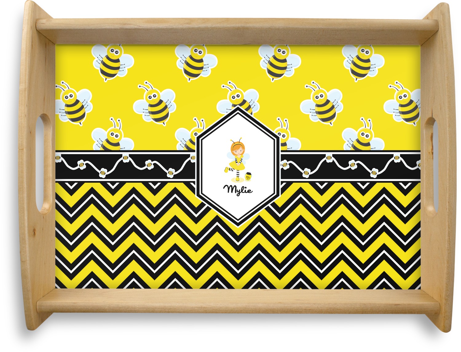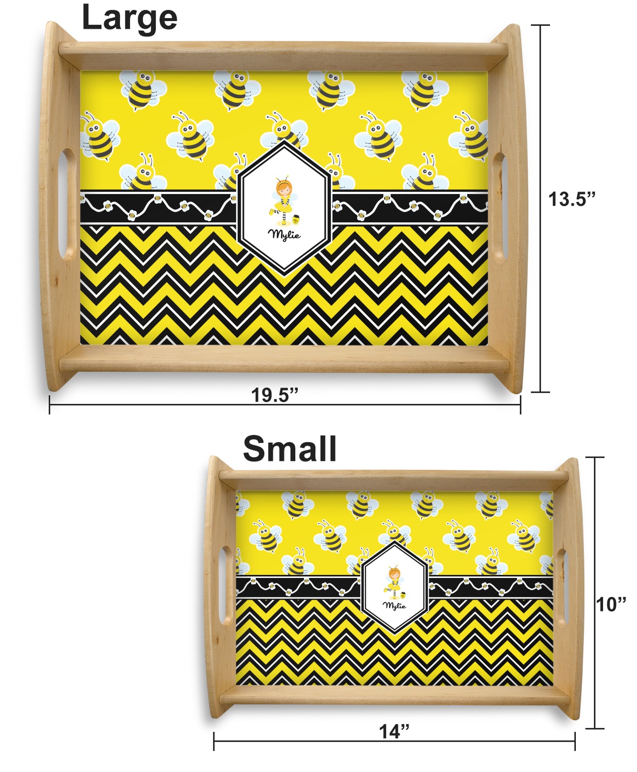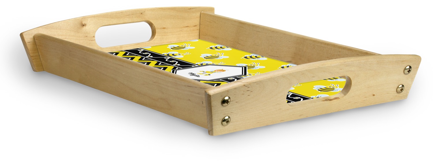 This serving tray with handles features square edges and two rounded sides, creating a very modern look. Each side is fabricated from a beautifully cut, natural wood. The bottom of the interior of the tray displays your customized design in bright, vibrant color. The tray is sold in both a black color and a natural wood look. Each variation of the wood serving tray has two sizes: Small, which is 14" x 10" x 2.25", and Large, which is 19.5" x 13.5" x 2.75".