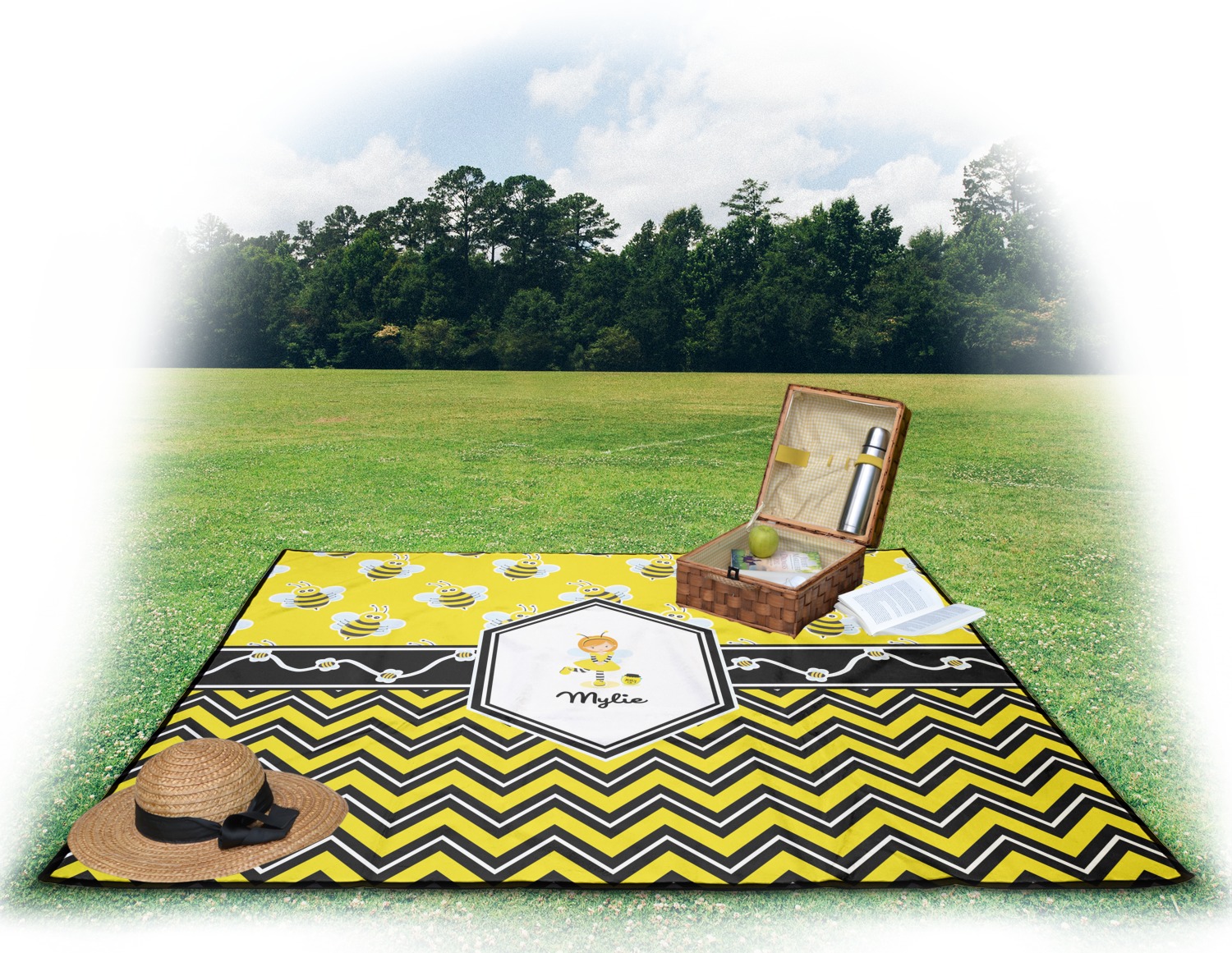 This picnic blanket is perfect for hanging out with your friends at the park or anywhere outside. The top of the blanket is made of a super soft microfiber fleece. The bottom of the blanket is made of a black material similar to a rain jacket and is water repellent as well. This will keep any wet spots on the ground from soaking through your picnic blanket. No one likes a wet blanket. The blanket measures at approximately 50" x 59" and has a nicely finished ribbon edge.
