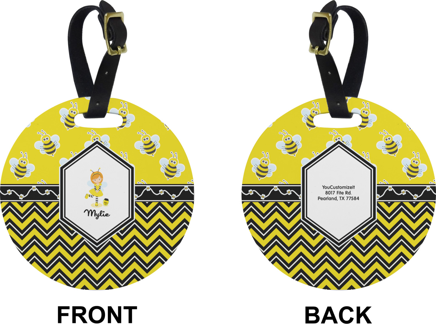 These personalized bag tags are sold in a variety of shapes, so that you may find the product that meets your vision exactly. We sell a round luggage tag, which measures at approximately 4" x 4". Our square luggage tag is about 3.5" x 3.5", while our rectangular version is 2.75" x 4 ".