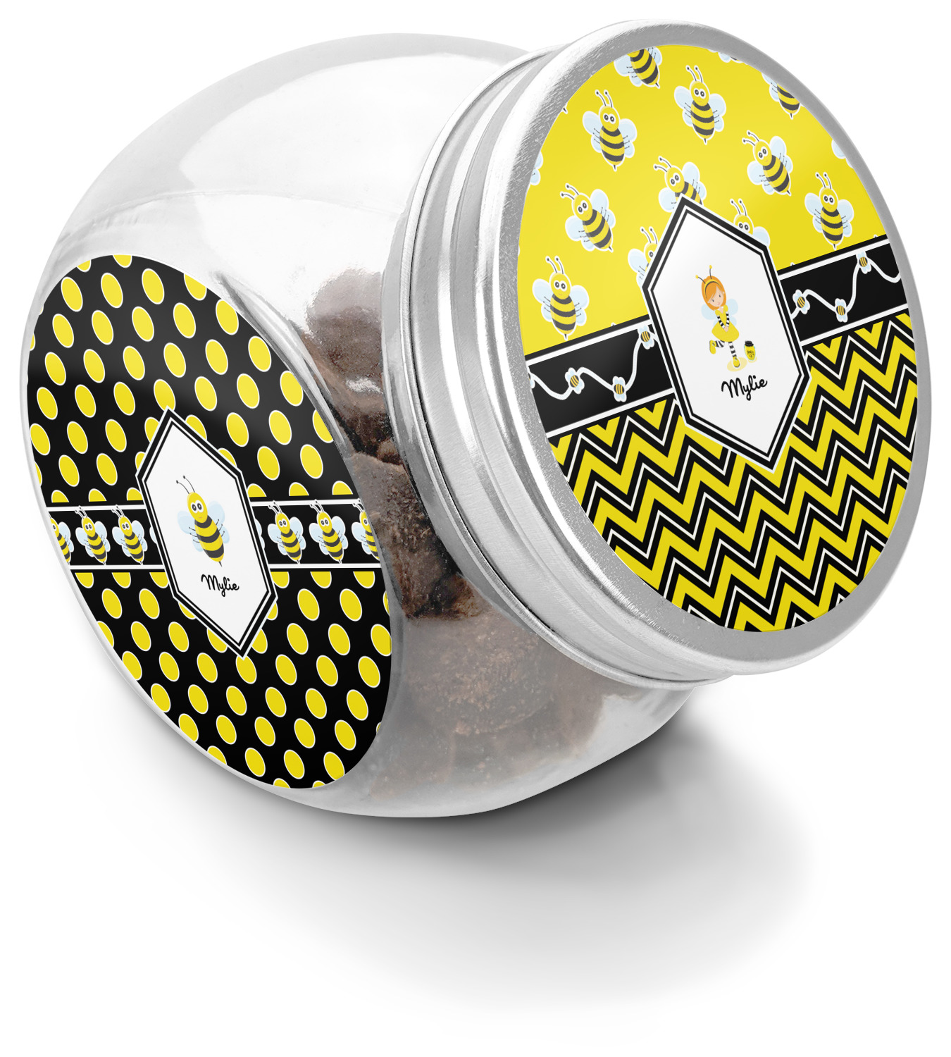 This treat jar is an excellent way to store treats for your favorite canine or feline. Moreover, their delicate, classy appearance makes them a tasteful addition to your countertop's décor. Crafted from clear glass, its unique construction and silver metal, screw-on lid allows for quick and easy access. Three, permanent, vinyl stickers are applied to both sides of the jar and lid, presenting your personalized design. The base of this glass, dog treat jar is 3.4" x 4.75", and the jar stands at 5" tall. Though on the smaller side, this jar is best suited for smaller treats or training treats.