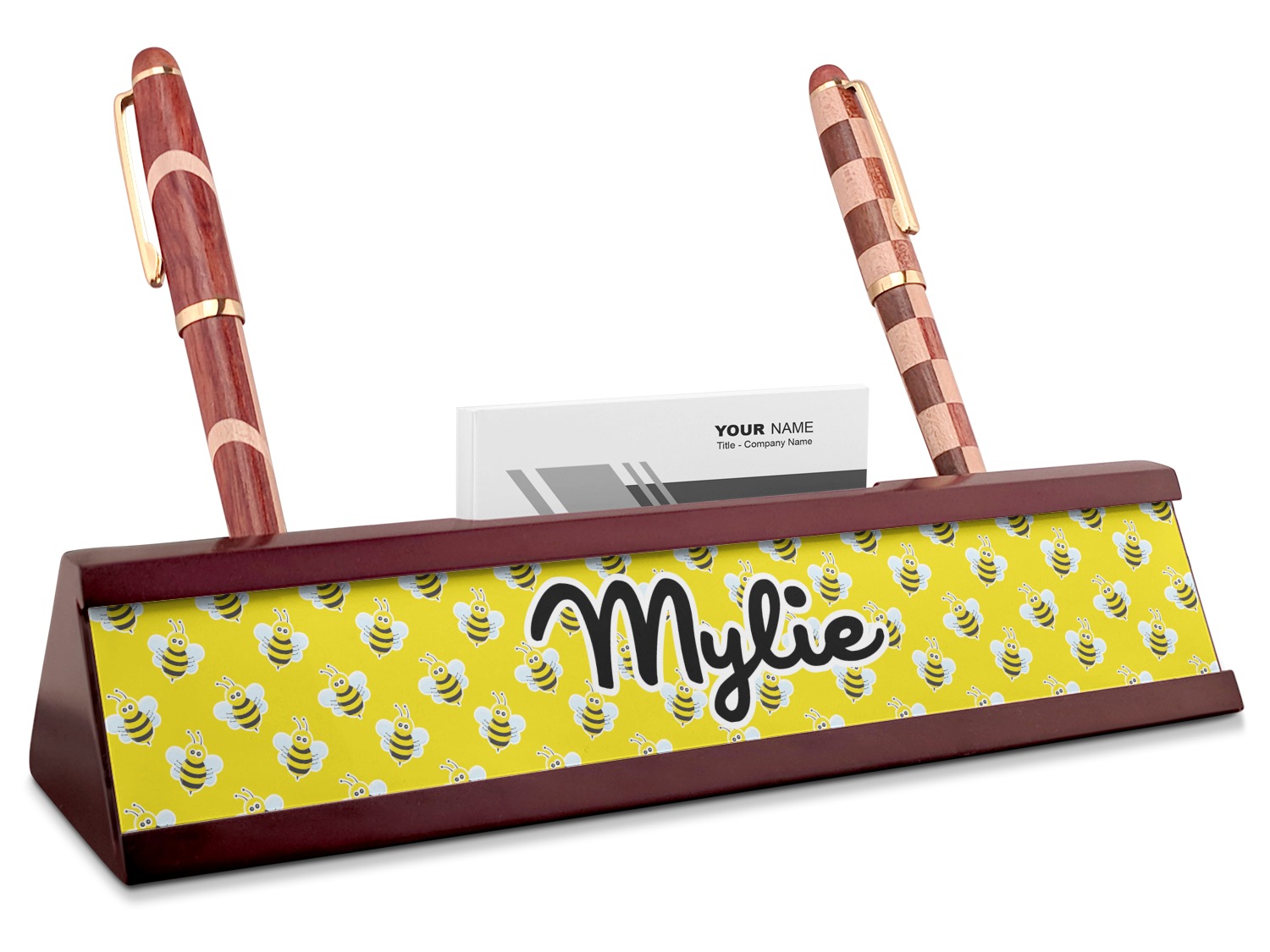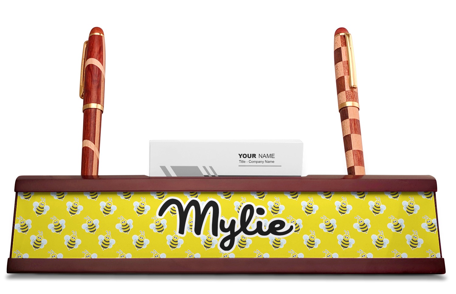 Your desk name plates are crafted from a high-quality, dark-cherry mahogany. At approximately 9.5 by 1.875 by 2.5 inches, this name plaque will fit perfectly, front and center, on your desk. Your customization spans across the entire face of the nameplate. Behind the nameplate lies a skinny slot that can fit approximately 15, traditionally-sized, business cards. You can also store your writing utensils on either side of this custom desk name plate.