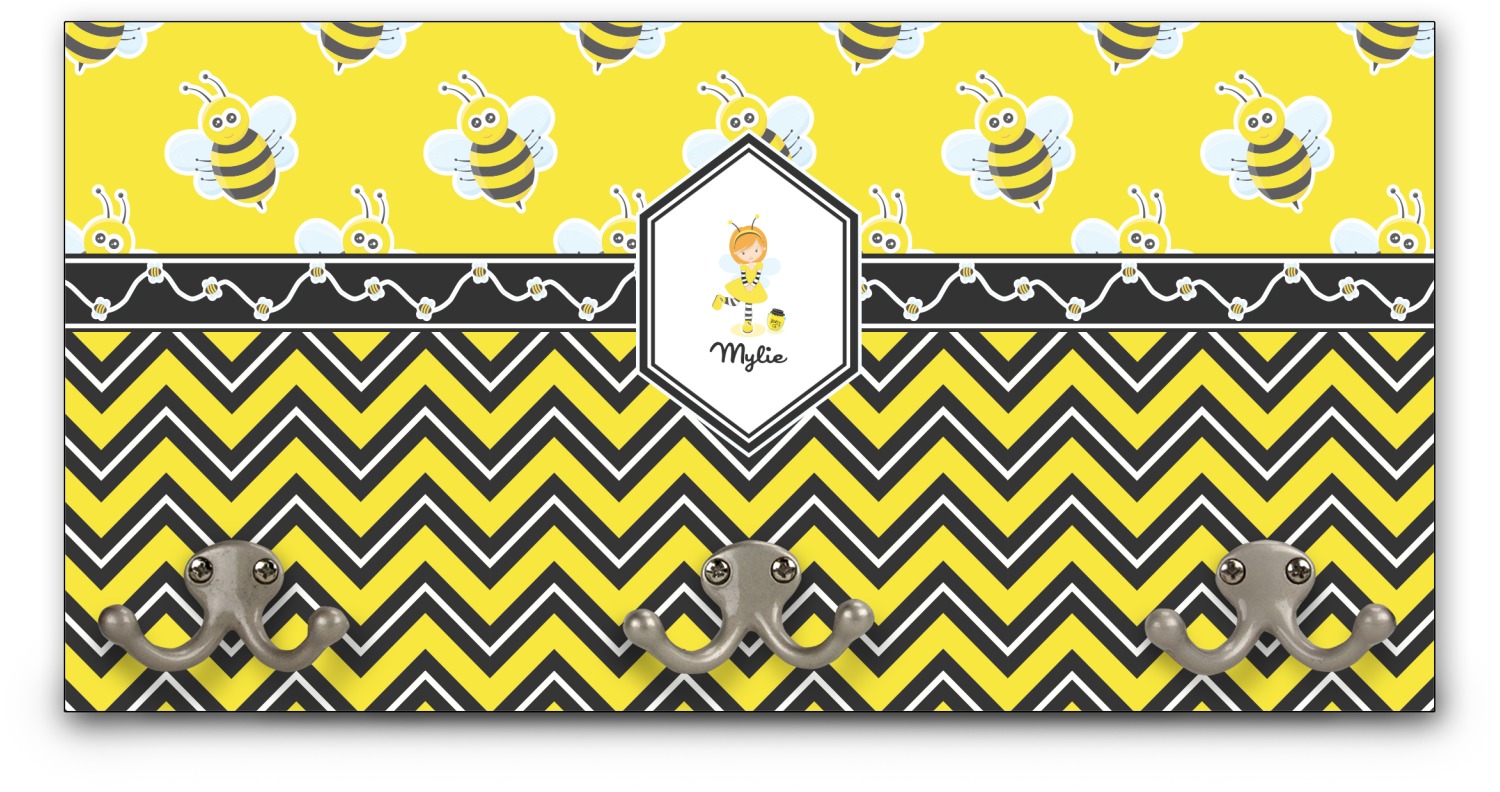 This coat rack is the perfect way to add some personality to your wall or entryway. The board is made of a strong maple that is approximately 16" x 8". The three 2-prong hooks are a sturdy metal that have three screws attaching them to the board. Your design is printed right onto the front of the board while the back and sides are a simple black.