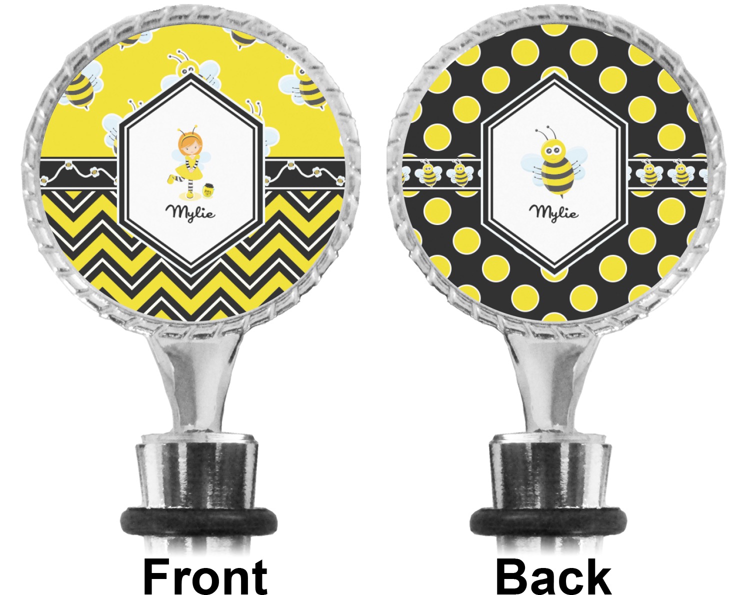 The top part of your bottle stopper is comprised of a zinc ring that displays your customization(s) in its middle, on both sides. The ring is heavy duty, with a bright chrome finish. The body of the wine stoppers have two silicone rings to provide an airtight seal. These wine bottle stoppers measure at 1.625" L x 0.8125" W x 4.625" H; your custom wine stopper is meant to fit into most standard-sized wine bottles.