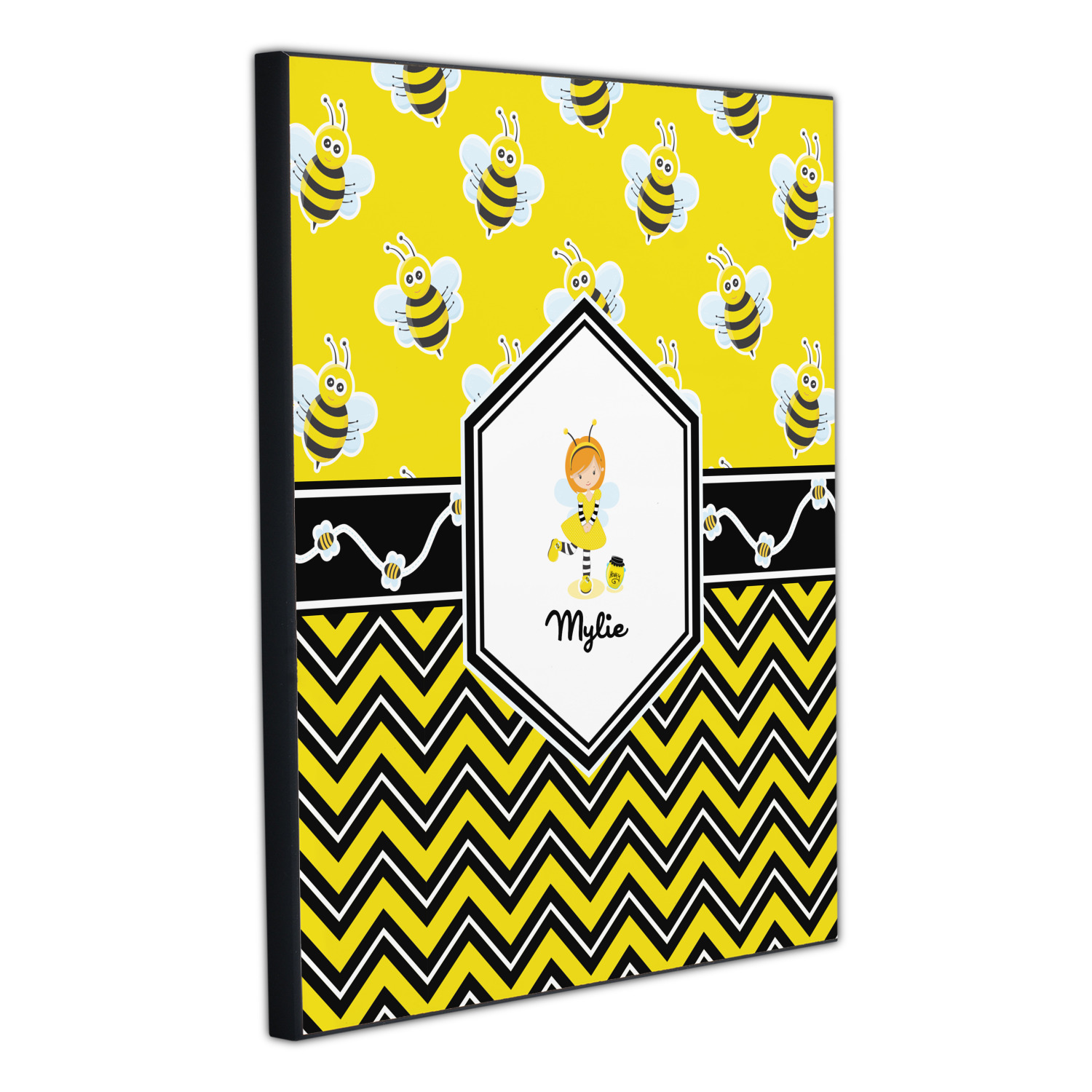 A wide white trimmed black ribbon is the background for a sweet little line of bees. A white decorative label that is trimmed in double rows of black will provide the focal point for either a little bumble-bee or a bumble-bee obsessed girl and his/her name. As a special touch, you can personalize your little bumble-bee girl's hair and skin color.