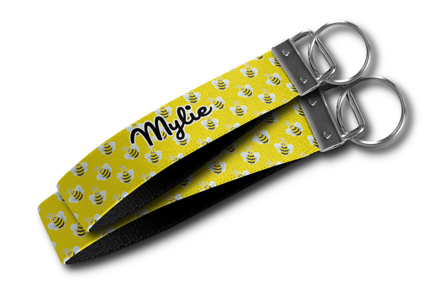 These key fob keychains are made from a polyester weave, right here in the USA. They feature a silver, metal clasp, attached to a round keyring. The piece gives the personalized wristlet a beautiful, finished look. Your customized design is printed on the outside of the keychain strap. We carry these wristlets in two sizes: small, which is 5 inches in width, and large, which is 5.5 inches in width.