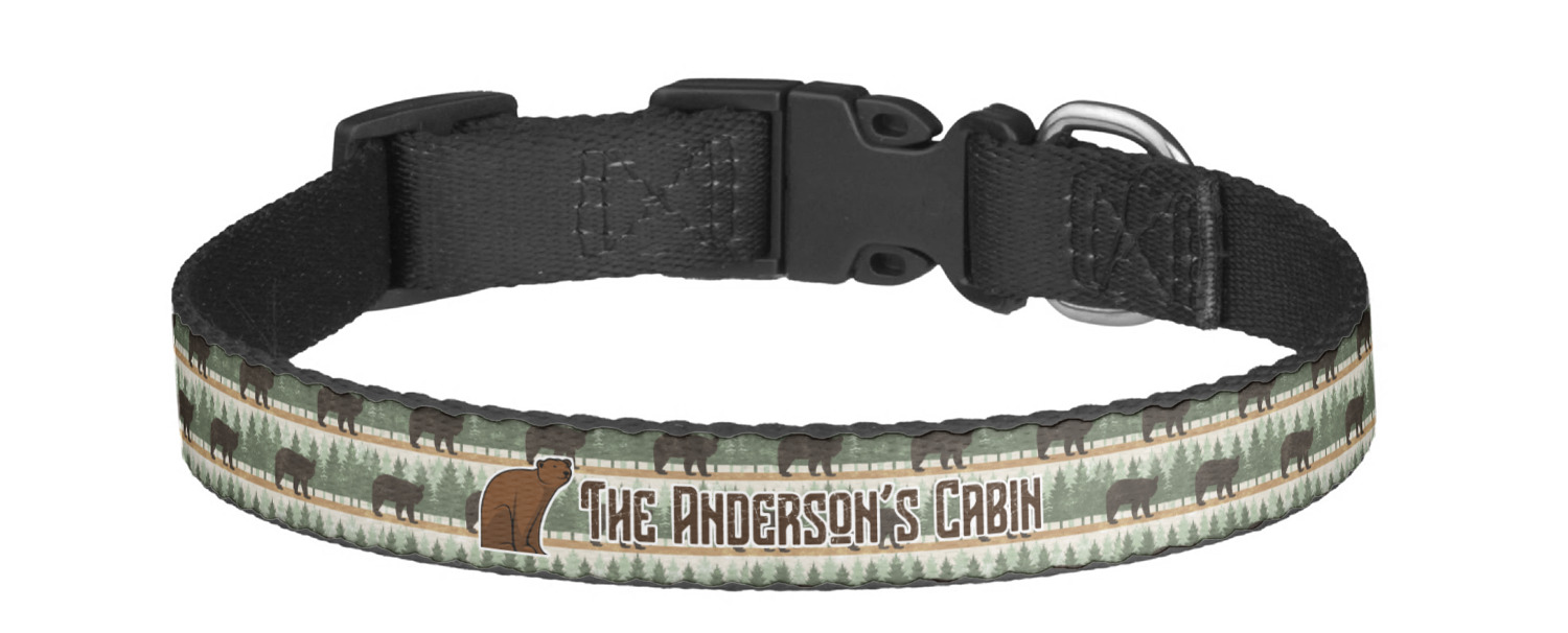 This sturdy collar, made from a durable nylon weave, will outlive your dog's episodes of excited tugging and pulling. Courtesy of its thick plastic buckle and adjuster, this collar is adjustable and accommodating of any dog. Structurally, the collar is a single piece of nylon weave that is sewn together, and features a solid metal loop where you can attach a leash or dog tag. We print and display your dog's name and pattern across the middle of the personalized dog collar.