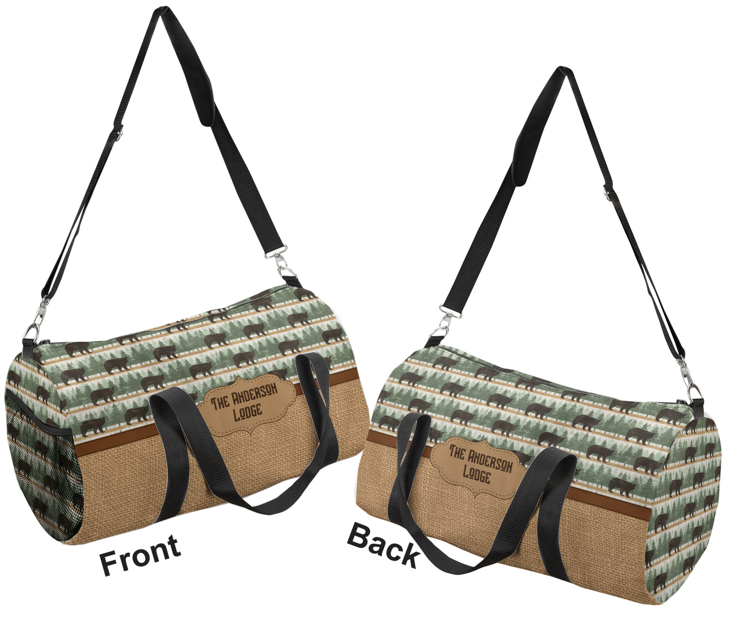 This duffle is a sturdy bag made of a canvas material. It comes in two sizes: Small (19"W x 9.5"H x 9.5"D) and Large (23"W x 12"H x 12"D). The bag is a cylindrical shape with a black adjustable strap and two handles. On one side is an elastic pouch to put a waterbottle or other small item. Your product will be sublimated with your design and is able to be designed on the front, back, and sides. Be sure to remember that the straps may cut into parts of your design if you upload your own artwork.
