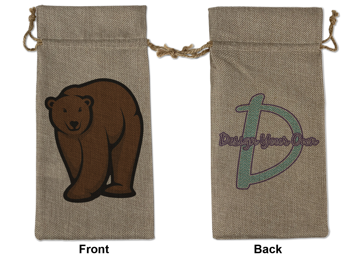 We sell our Burlap Gift Bags in 3 variant sized bags. Made with burlap polyester, each personalized bag can be secured with a twine drawstring pull. Your custom design is available to print on one side or both sides - completely up to you! The sizes of the bags measure approximately 4.5" x 6.5" for the smallest size, 6.5" x 8.0" for the medium size, and 6.5" x 13.5" for the large-sized bag.