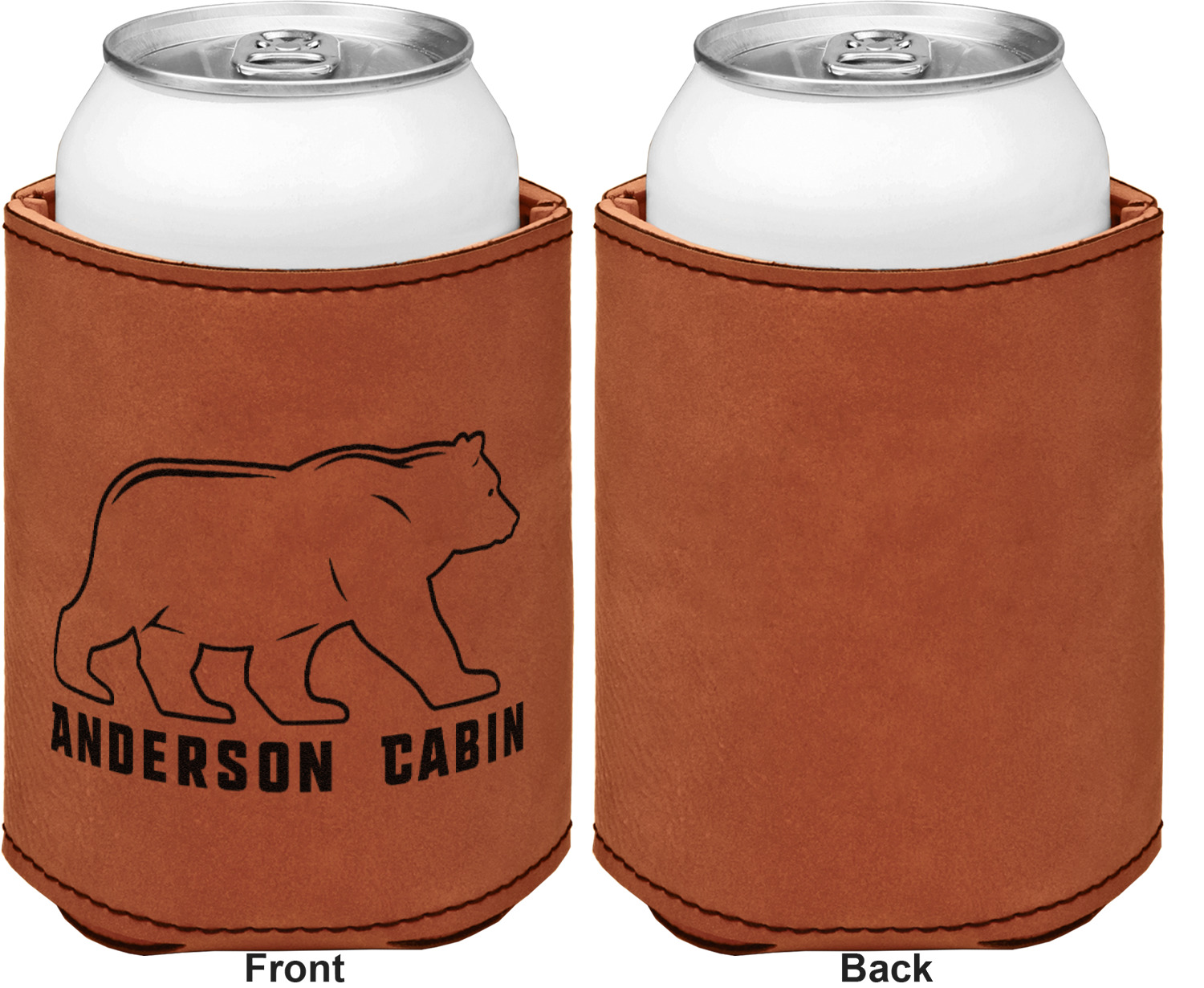 This can sleeve is made from a cognac-brown leatherette and stitched with a sturdy, black thread. A slim padding lines the inside of your can sleeve to allow for a better fit once your drink is inserted. The sleeve itself measures at 4 by 4.5 inches, allowing this custom can sleeve to accommodate most canned drinks. Your personalized design can be engraved on the front and back, or solely the front. When laser-engraved, your design appears as a black coloration which contrasts the leatherette nicely.