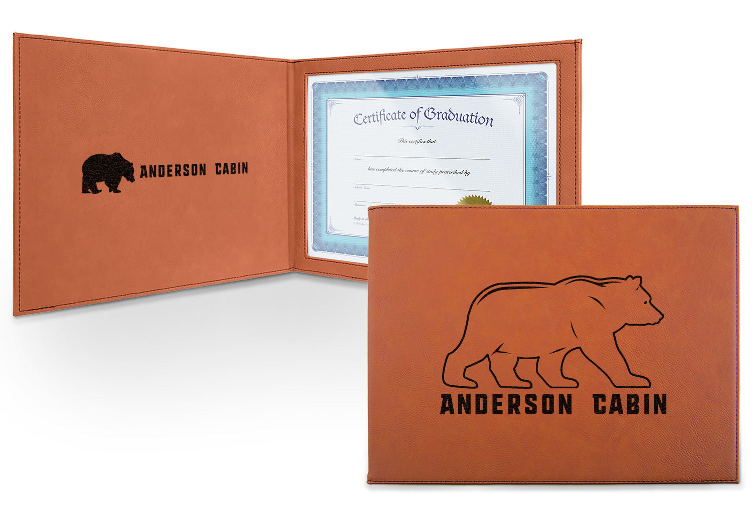 This cognac-colored, leatherette certificate jacket is the ideal way to display or store your hard-earned certificate. When closed, the custom certificate holder measures at 12 by 9 inches. The interior of the certificate cover includes a clear, vinyl window to encase your diploma. The window measures at around 10.5 by 7.5 inches and can accommodate a diploma that measures at up to 8.5 by 11 inches. You can either choose to have your customization laser engraved on the front and interior, or solely the front.
