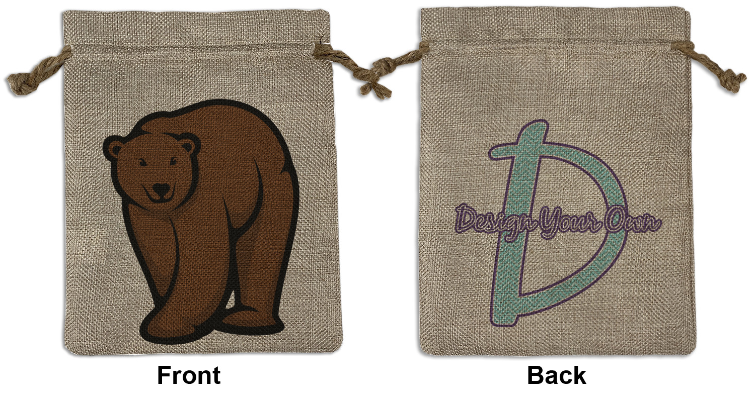 We sell our Burlap Gift Bags in 3 variant sized bags. Made with burlap polyester, each personalized bag can be secured with a twine drawstring pull. Your custom design is available to print on one side or both sides - completely up to you! The sizes of the bags measure approximately 4.5" x 6.5" for the smallest size, 6.5" x 8.0" for the medium size, and 6.5" x 13.5" for the large-sized bag.
