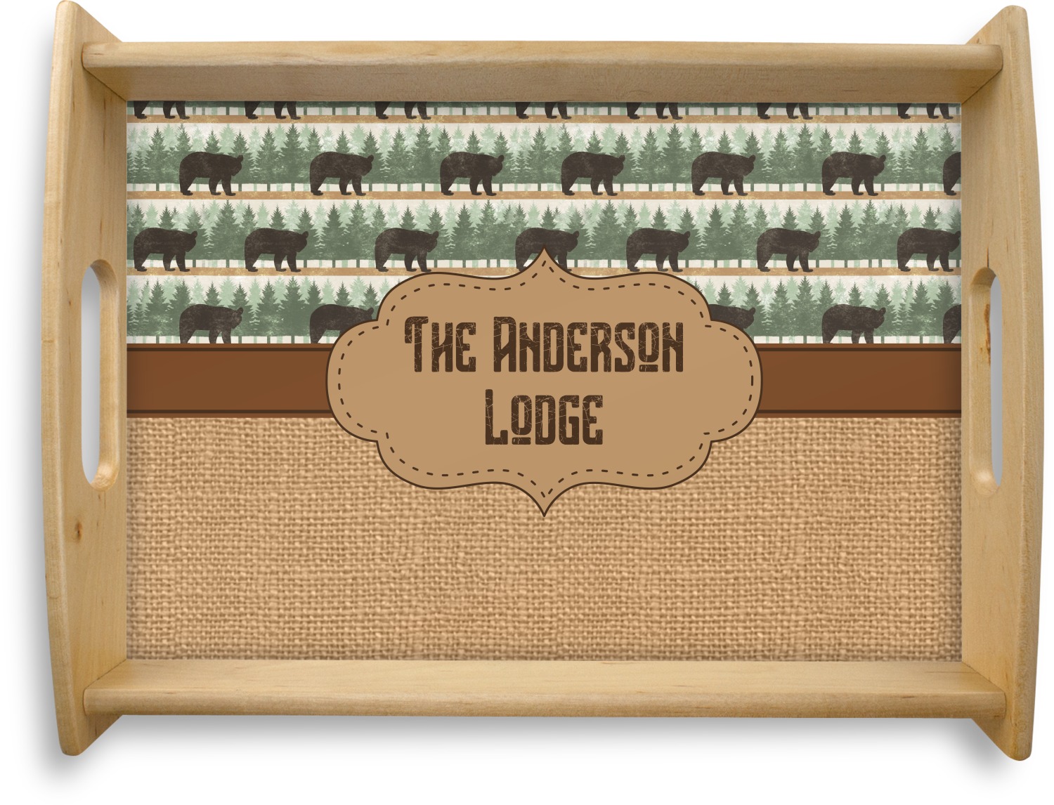 This serving tray with handles features square edges and two rounded sides, creating a very modern look. Each side is fabricated from a beautifully cut, natural wood. The bottom of the interior of the tray displays your customized design in bright, vibrant color. The tray is sold in both a black color and a natural wood look. Each variation of the wood serving tray has two sizes: Small, which is 14" x 10" x 2.25", and Large, which is 19.5" x 13.5" x 2.75".