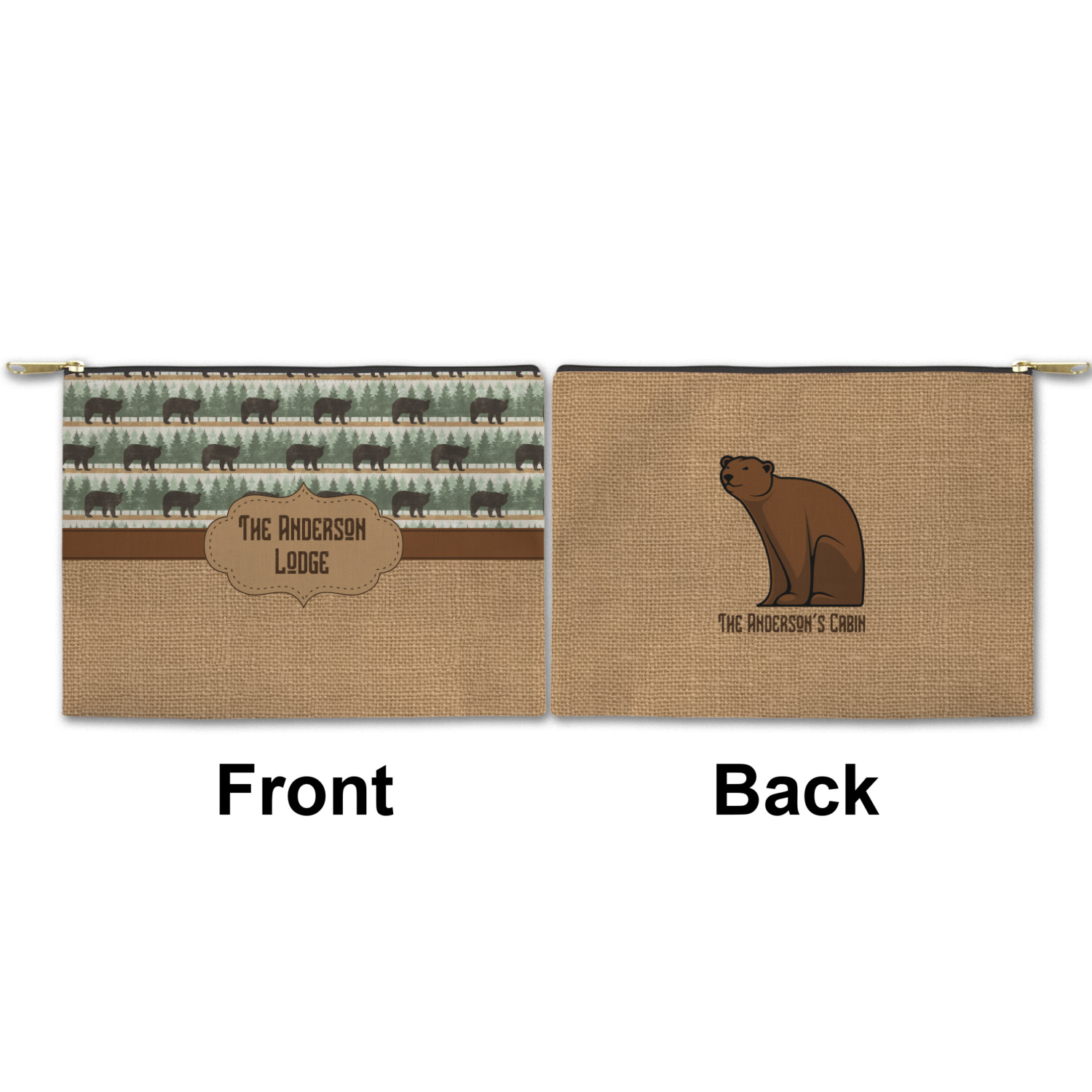 Our zippered pouches are available in two sizes - small: approx 8.5W"x6H and large: approx 12.5Wx8.5H. The pouches are made from a soft & durable canvas fabric that is printed on the outside with your design; the inside has a fused black lining. The printed canvas fabric is then cut and the pouches are sewn right here in the USA. The zipper itself is gold in color and has a round hook.