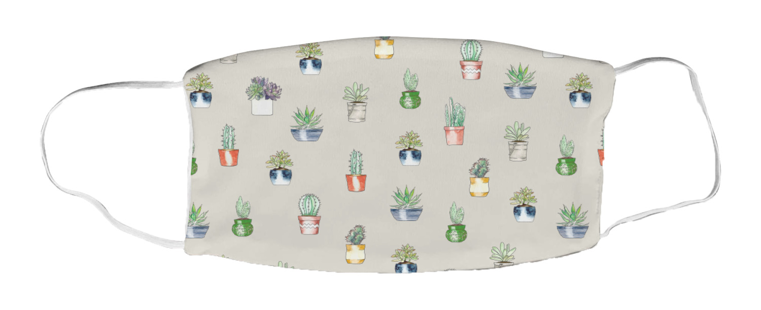 This design has a neutral tan background in order to let the cacti really stand out. You will find two different patterns of potted cacti and potted succulents from a bird's-eye view. The succulents consist of cacti, aloe, and your typical succulent plants. A fun plum and mint colors are used as accent colors throughout the design.
