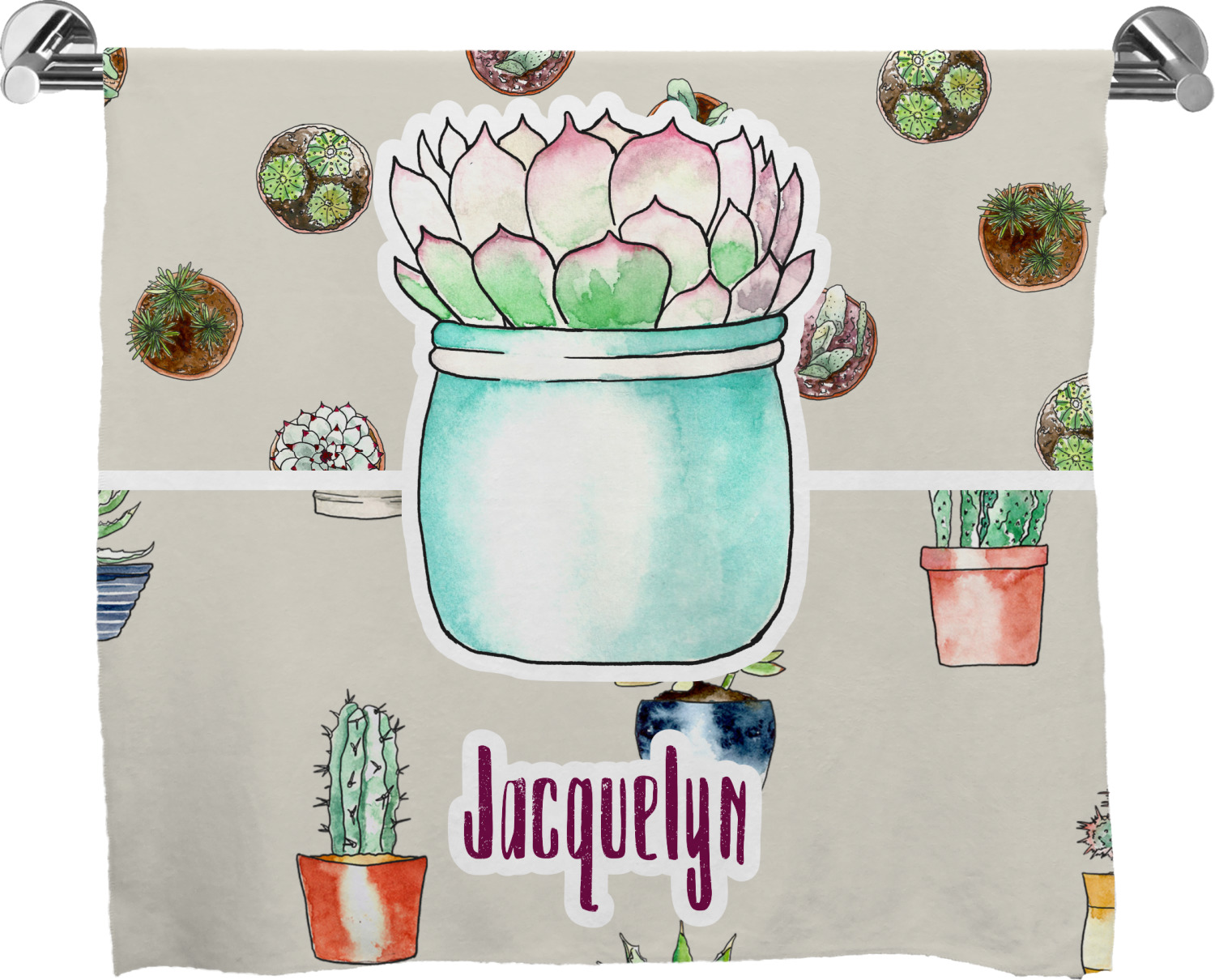 These customized bath towels are slightly larger than your standard towel and are the ideal size for wrapping around your body. They measure approximately 60" x 30". Your customization is displayed across the entire front face of the towel, while the back is white.