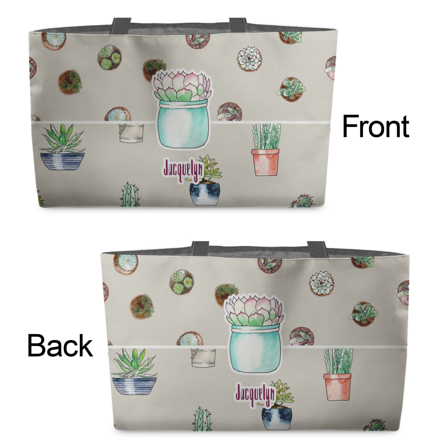 You can design the totes with a design on the front and another one on the back. The two designs can be identical or completely different. The choice is yours.