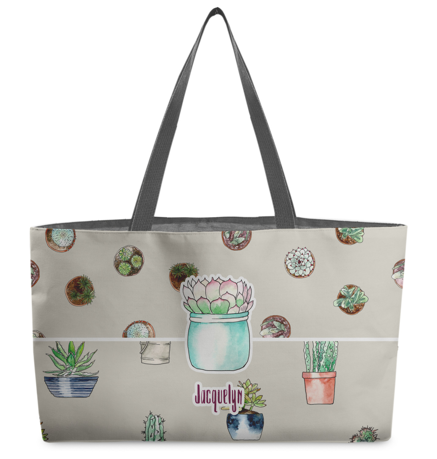 These beach totes are handmade here in the USA. Fabric is printed with your design. The tote is then sewn from the fabric pieces, lining and handles added.