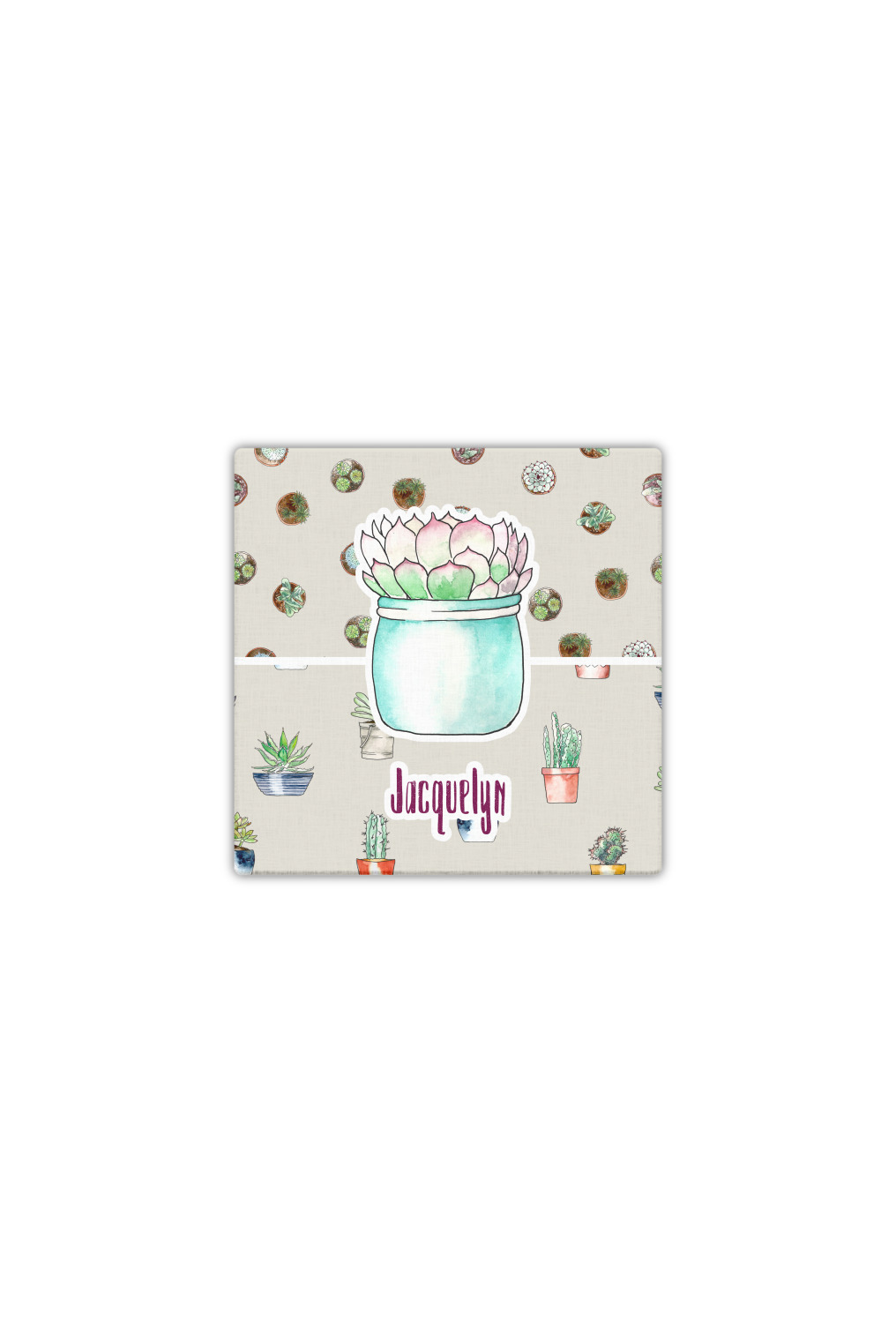 This design has a neutral tan background in order to let the cacti really stand out. You will find two different patterns of potted cacti and potted succulents from a bird's-eye view. The succulents consist of cacti, aloe, and your typical succulent plants. A fun plum and mint colors are used as accent colors throughout the design.