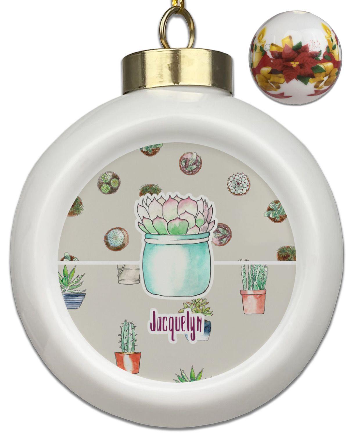 Our Christmas ornaments are a unique ceramic ball shape with a twist as it has a flat face to display your custom design! Select from one of our two design types - Christmas Tree or Poinsettia Garland - to adorn the curved back of your personal design. Each ornament measures 3H x 2.5W x 2D accompanied with a gold string accent for finishing touches to hang on your beautiful Christmas tree!
