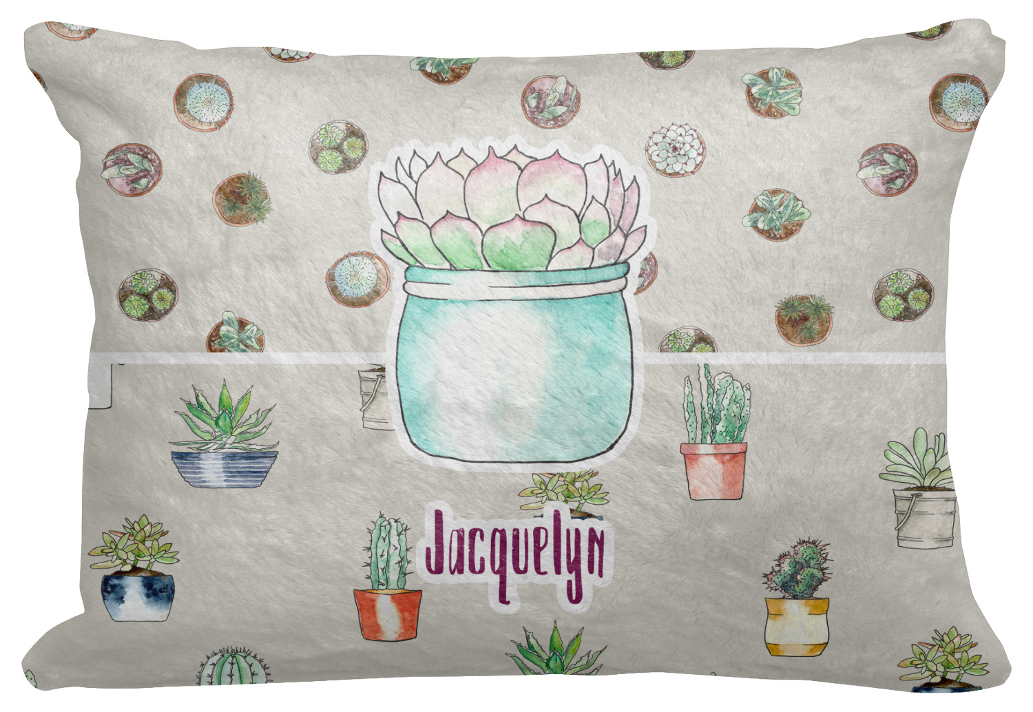 This design has a neutral tan background in order to let the cacti really stand out. You will find two different patterns of potted cacti and potted succulents from a bird's-eye view. The succulents consist of cacti, aloe, and your typical succulent plants. A fun plum and mint colors are used as accent colors throughout the design.