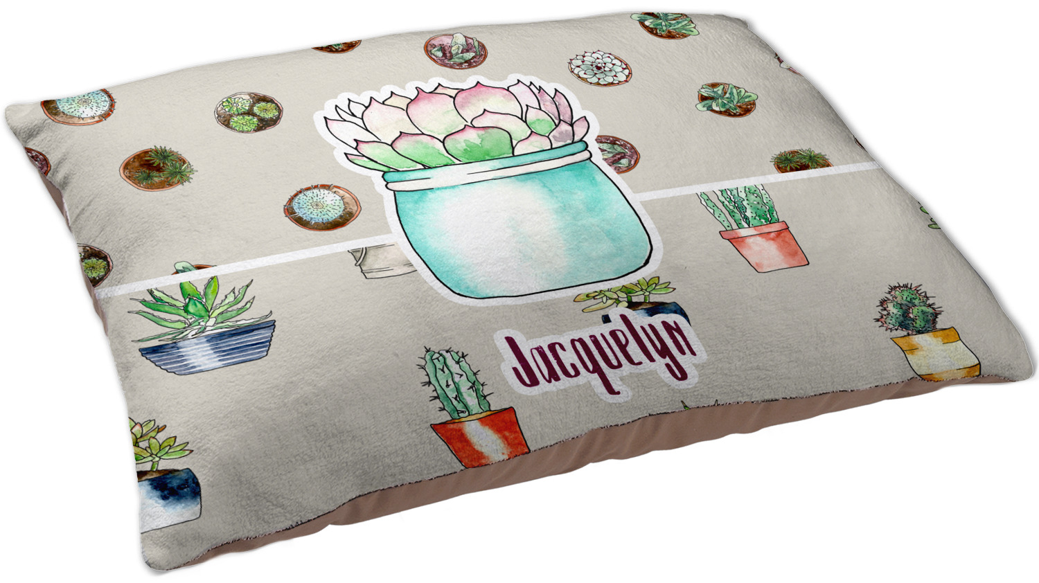 This design has a neutral tan background in order to let the cacti really stand out. You will find two different patterns of potted cacti and potted succulents from a bird's-eye view. The succulents consist of cacti, aloe, and your typical succulent plants. A fun plum and mint colors are used as accent colors throughout the design.