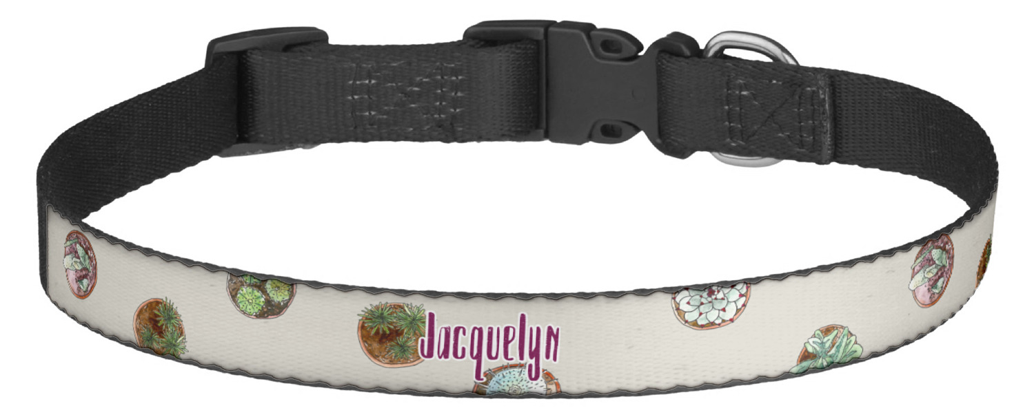 This sturdy collar, made from a durable nylon weave, will outlive your dog's episodes of excited tugging and pulling. Courtesy of its thick plastic buckle and adjuster, this collar is adjustable and accommodating of any dog. Structurally, the collar is a single piece of nylon weave that is sewn together, and features a solid metal loop where you can attach a leash or dog tag. We print and display your dog's name and pattern across the middle of the personalized dog collar.