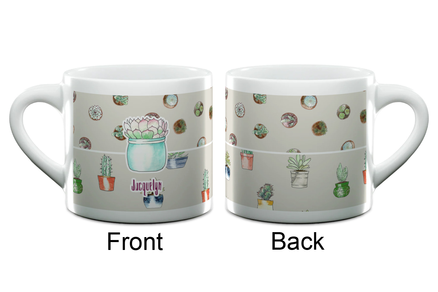 Each of our espresso mugs is a ceramic material sure to keep your drink warm. Personalize one cup for yourself, or order a set of 4! Its the perfect little gift for any coffee lover! We carry two sizes for you to personalize - 3 oz. (approx. 3.25" x 2.325" x 2.625") or 6 oz. (approx. 4" x 2.9" x 2.9"). Our 3 oz. mug is perfect for that single shot espresso while our 6 oz. mug can be your next favorite cappuccino cup holding two shots of espresso!