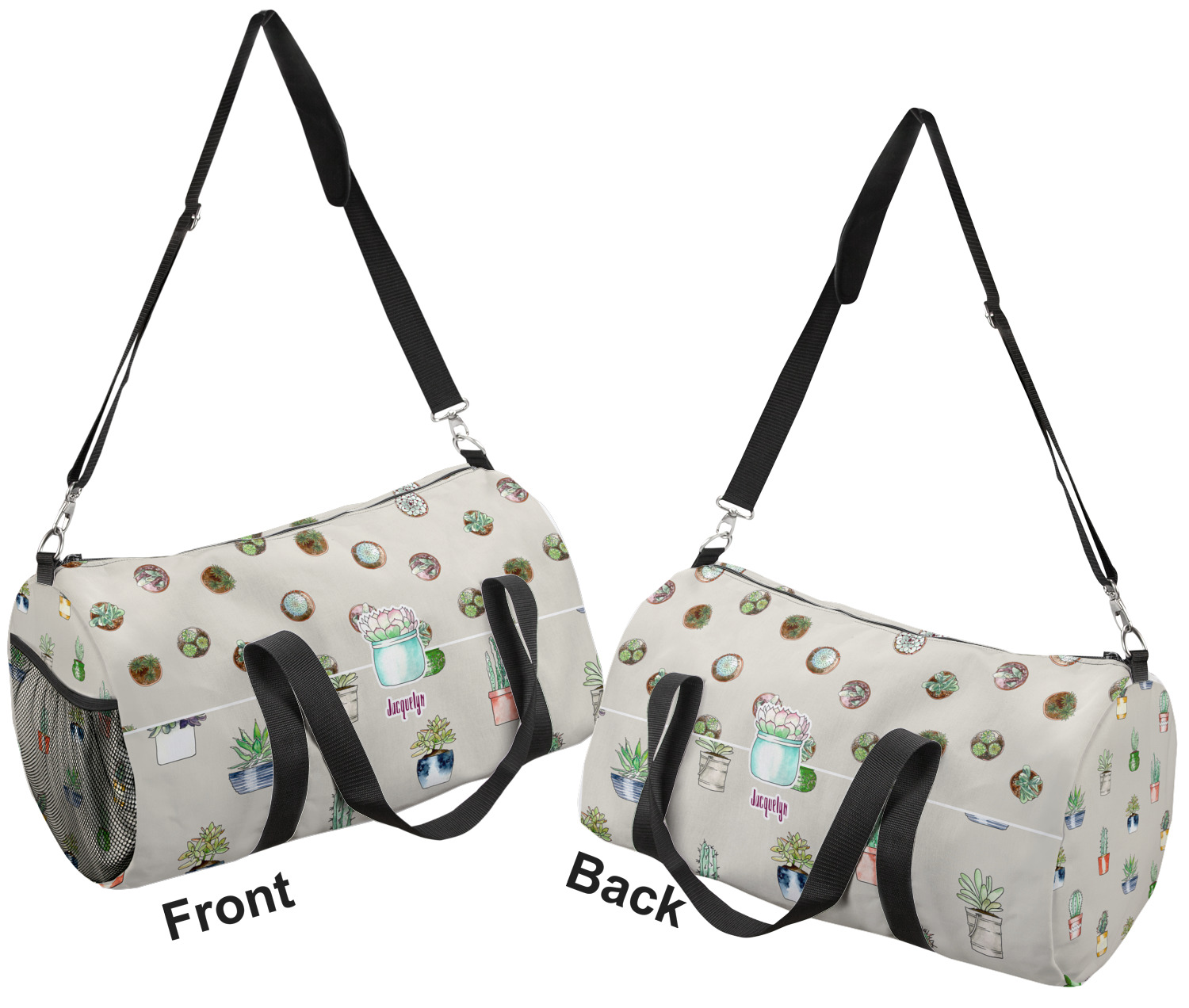 This duffle is a sturdy bag made of a canvas material. It comes in two sizes: Small (19"W x 9.5"H x 9.5"D) and Large (23"W x 12"H x 12"D). The bag is a cylindrical shape with a black adjustable strap and two handles. On one side is an elastic pouch to put a waterbottle or other small item. Your product will be sublimated with your design and is able to be designed on the front, back, and sides. Be sure to remember that the straps may cut into parts of your design if you upload your own artwork.