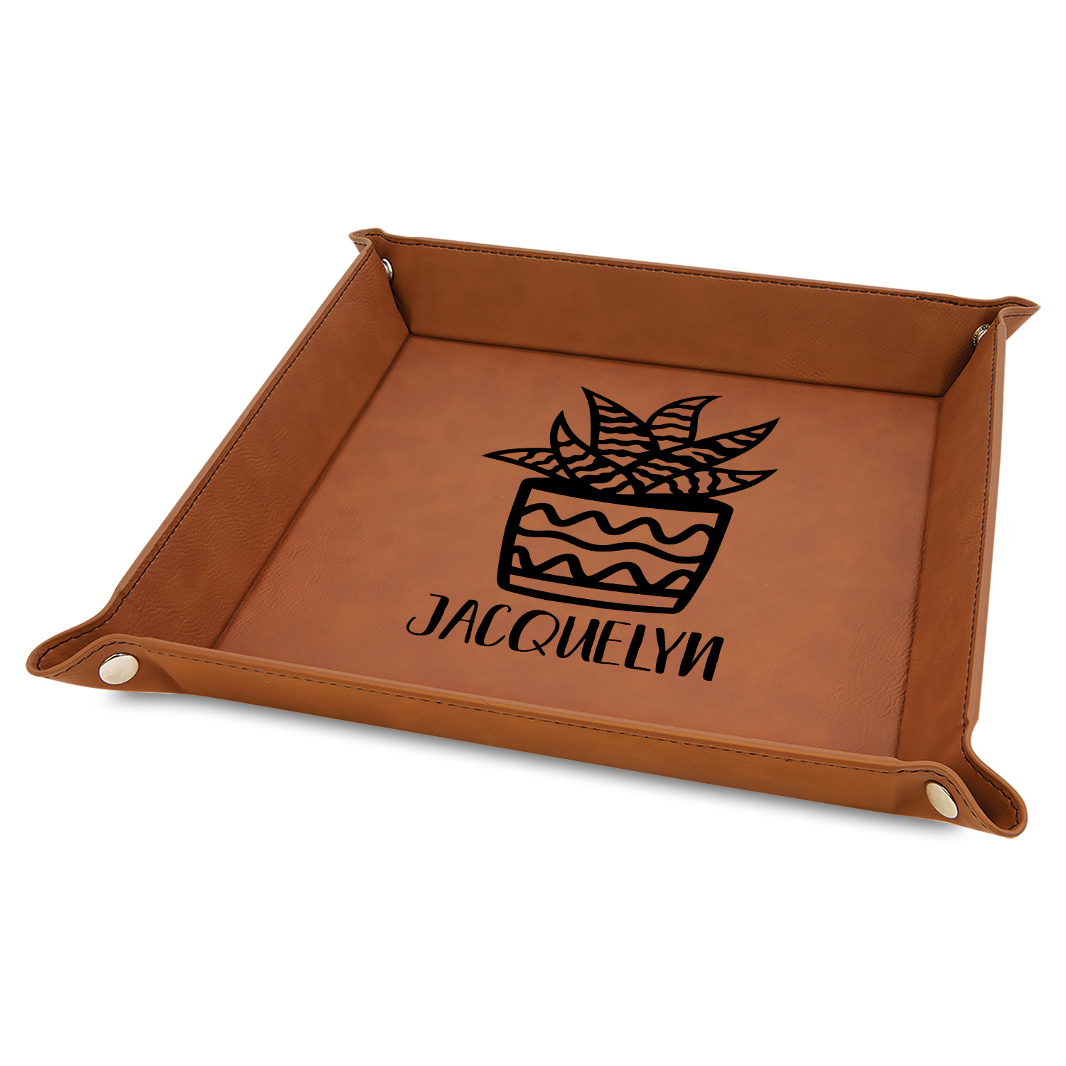 The leatherette wraps the hard board base and sides with flexible hinges to fold the sides up. The corners are secured using silver snaps. The 6in x 6 in tray measures approximately 9.5in x 9.5in when laid flat. The 9in x 9in tray measures approximately 13in x 13in when laid flat.