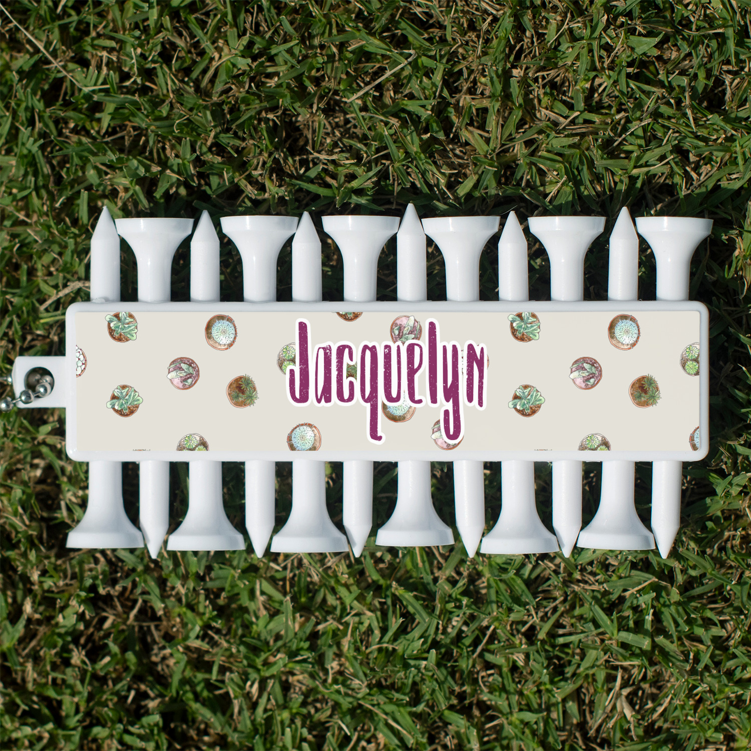 With 12 tees on a lightweight, portable key chain, it almost ensures a great 18 holes. Our tees are made of white plastic and are a little over 2". Design the front and the back of the golf tee holder. Pick from over a hundred designs, colors, and personalization styles! The set even comes with three removable ball markers as well!