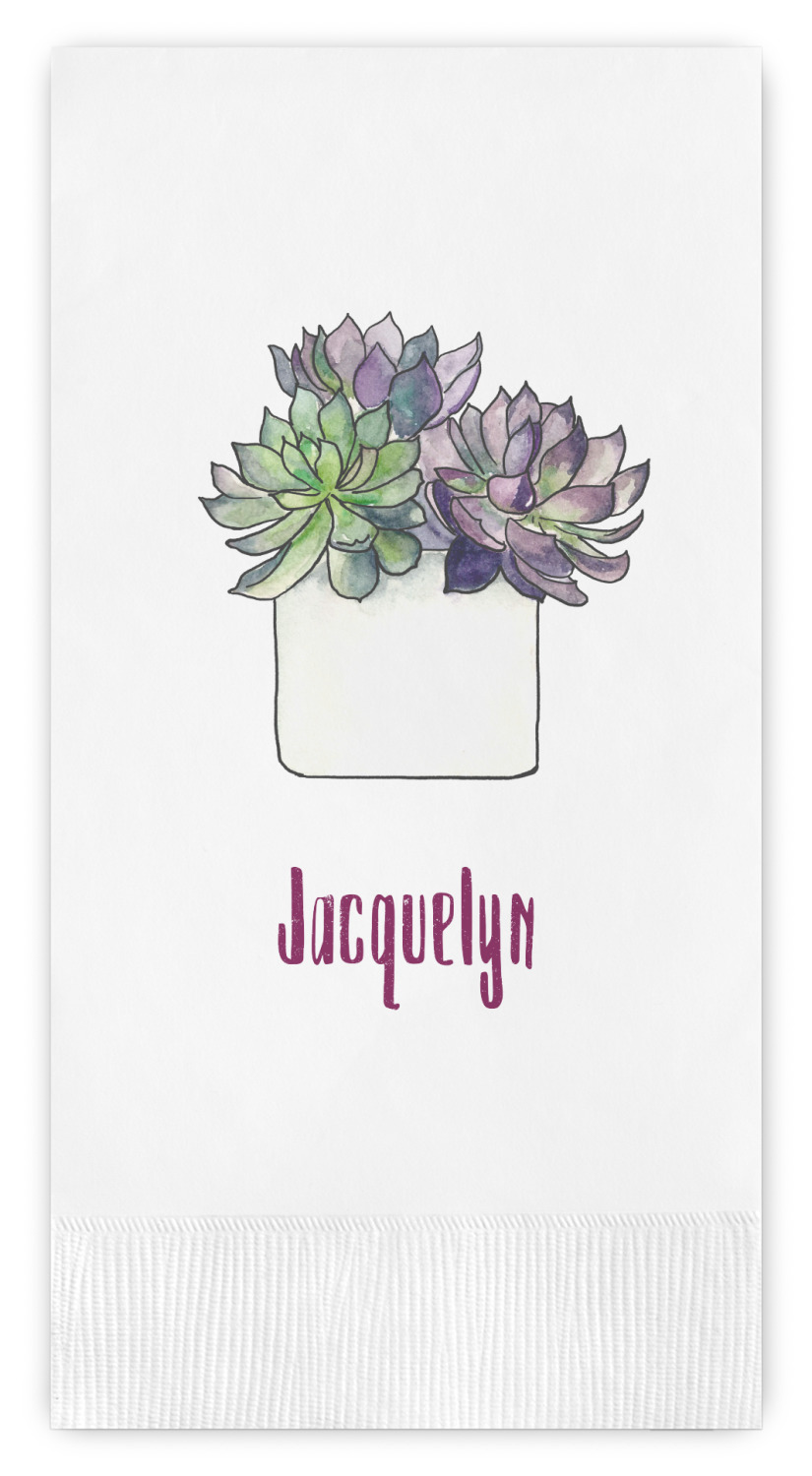 This design has a neutral tan background in order to let the cacti really stand out. You will find two different patterns of potted cacti and potted succulents from a bird's-eye view. The succulents consist of cacti, aloe, and your typical succulent plants. A fun plum and mint colors are used as accent colors throughout the design.