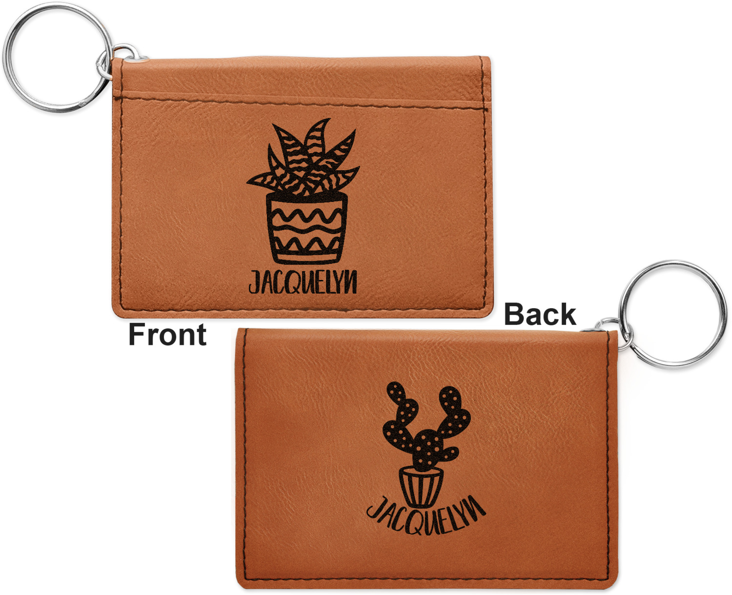 These ID wallet keychains features three pockets on the inside to accommodate your ID and your most frequently used cards. Another pocket occupies the front of the wallet's exterior, and can hold some cash or another card. The wallet is accompanied by a thick metal ring for easy attachment to a belt clip or purse. Each card holder keychain measures at 4.25 by 3 inches and is a beautiful, cognac, medium-brown shade. The personalized monogram, font, or graphic of your choosing is laser engraved into the surface of the wallet, creating a black imprint. We sell these ID wallets in two models: single sided and double sided engraving.