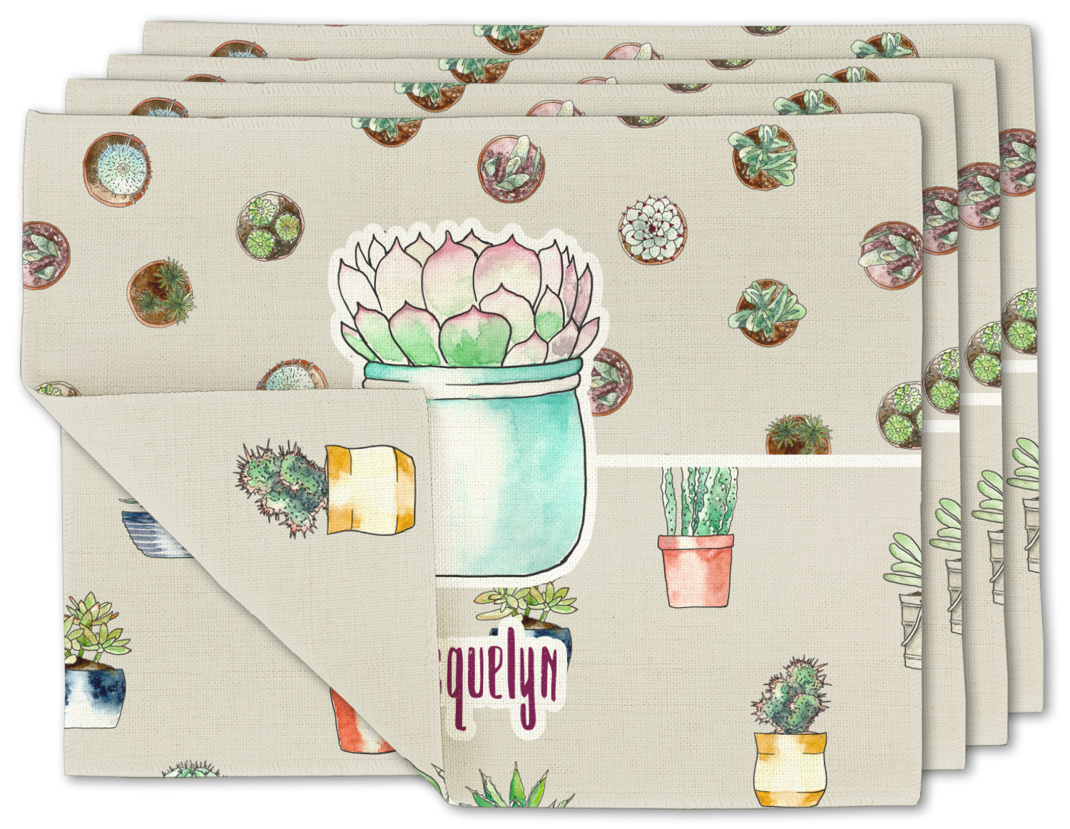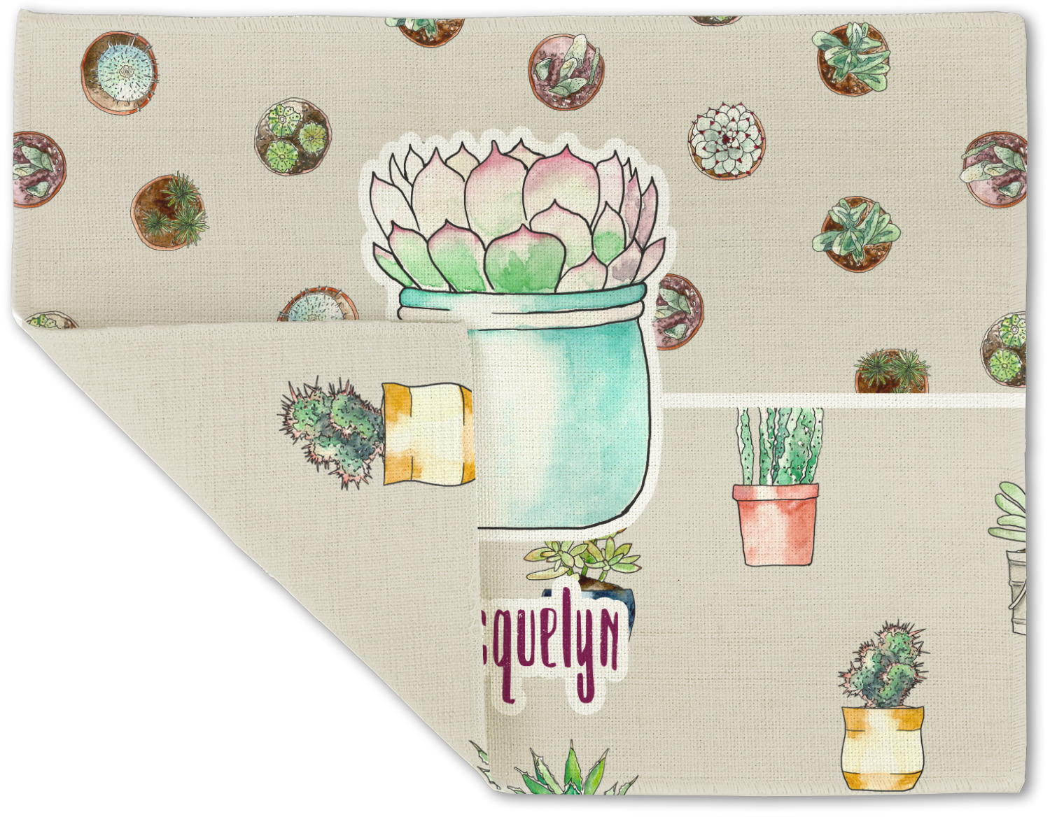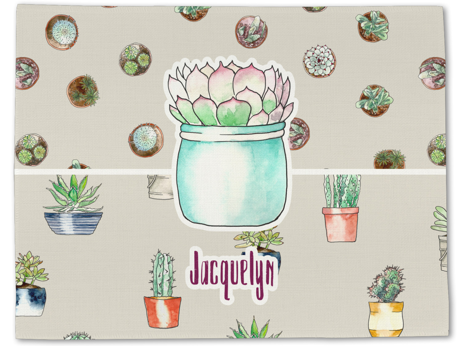 This design has a neutral tan background in order to let the cacti really stand out. You will find two different patterns of potted cacti and potted succulents from a bird's-eye view. The succulents consist of cacti, aloe, and your typical succulent plants. A fun plum and mint colors are used as accent colors throughout the design.