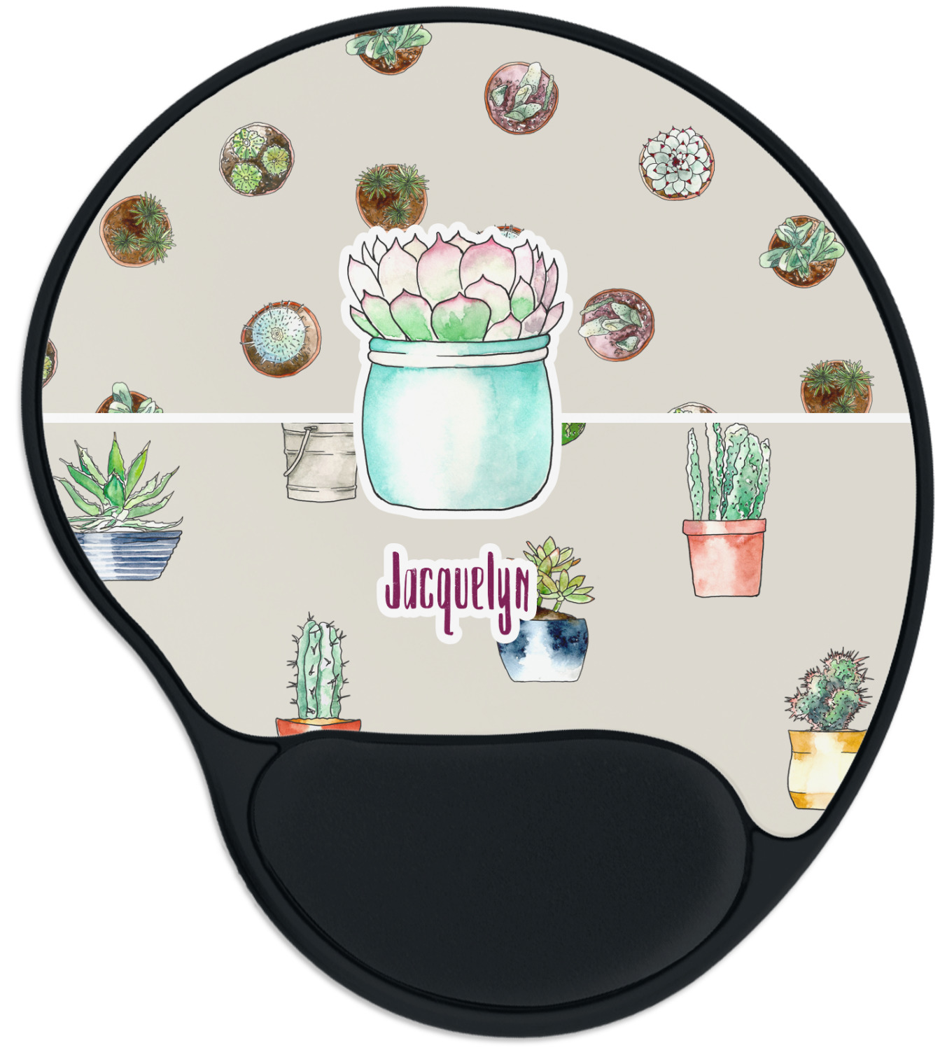 The top of these personalized mouse pads are made from a polyester, while the underside is plastic. The back of these mouse mats include rubber feet to prevent any slippage while in use. A padded wrist support, made from plush memory foam, occupies the bottom section of these computer mouse pads. Your customized design is printed onto the face of this mat, with the remaining sides and support piece colored in black. The mat itself is rounded and measures at 10.25" x 9.13".