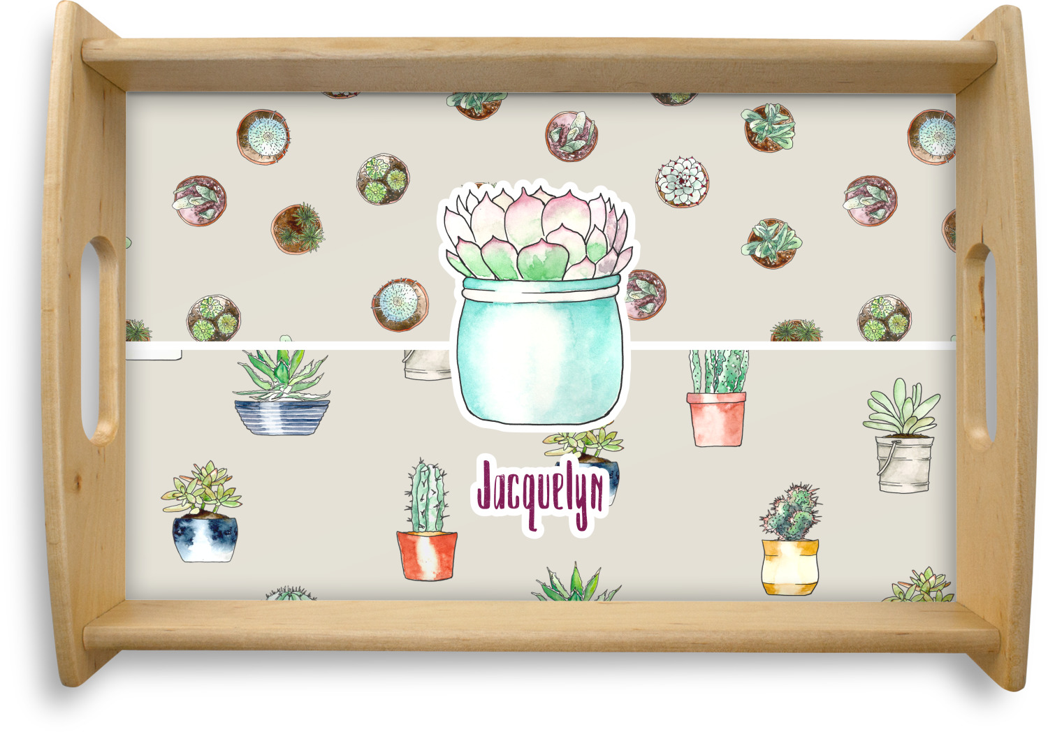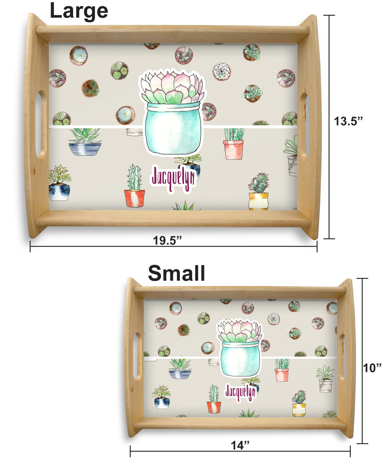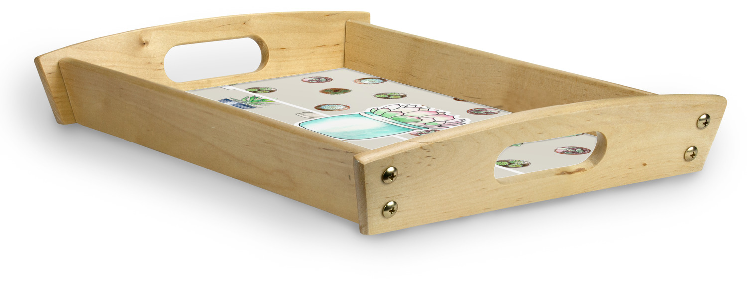This serving tray with handles features square edges and two rounded sides, creating a very modern look. Each side is fabricated from a beautifully cut, natural wood. The bottom of the interior of the tray displays your customized design in bright, vibrant color. The tray is sold in both a black color and a natural wood look. Each variation of the wood serving tray has two sizes: Small, which is 14" x 10" x 2.25", and Large, which is 19.5" x 13.5" x 2.75".